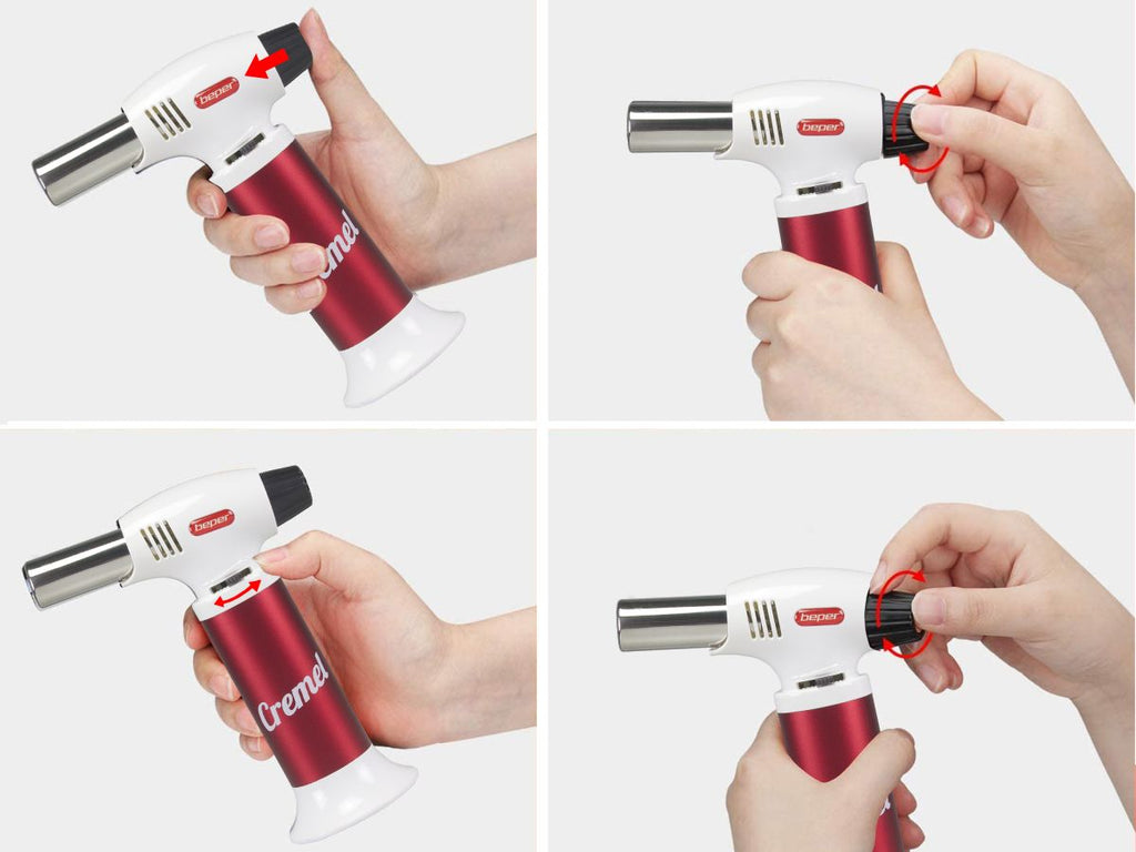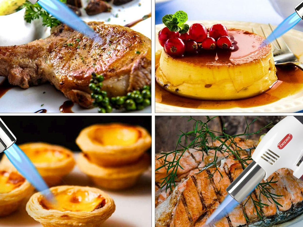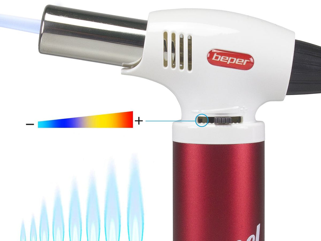 Bunsenbrenner aus Metall und Abs. Ausgestattet mit einem Hebel zur Regulierung des Gasaustritts und damit der Flammenintensität. Knopf zum Ein- und Ausschalten. Betrieb mit Butangas (nicht im Lieferumfang enthalten), leicht wiederaufladbar. Ideal für die Zubereitung von Crème Brûlée, Marshmallow und Baiser.