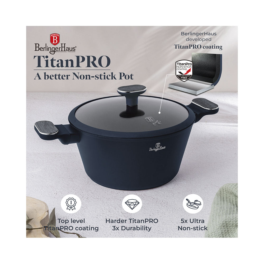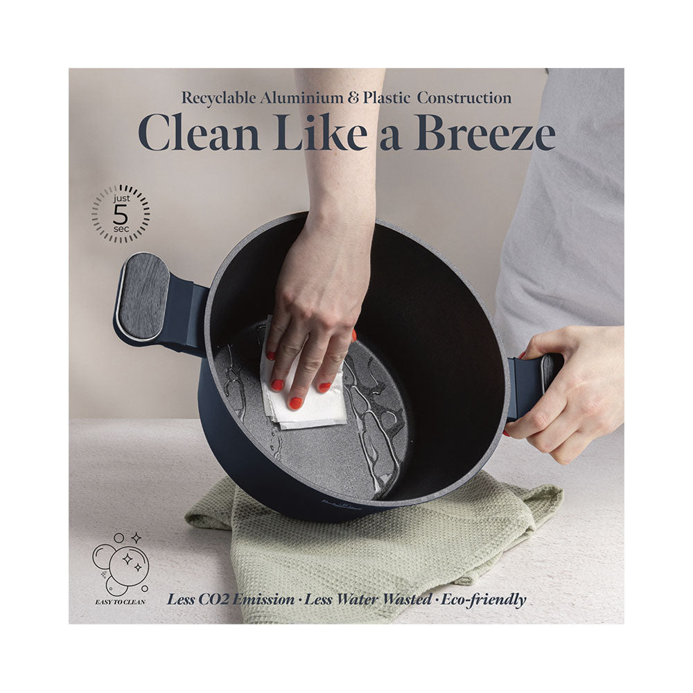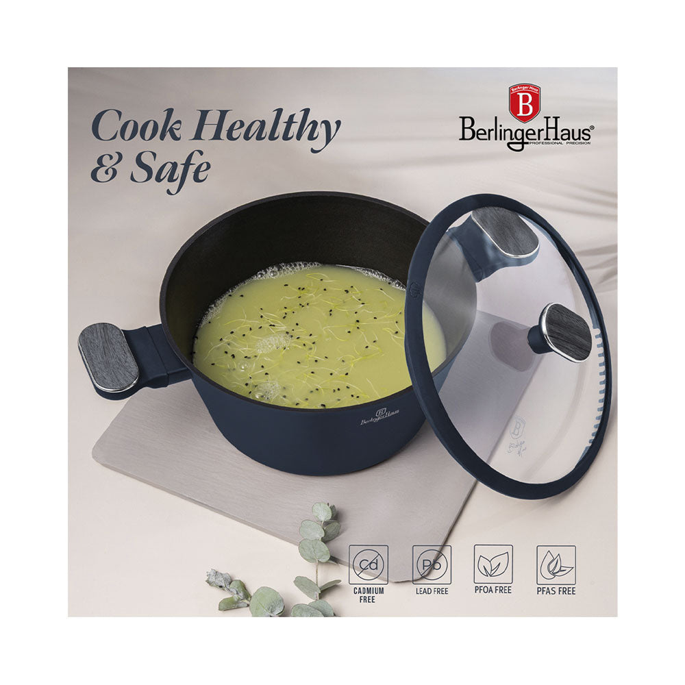 Das 10-teilige Kochgeschirr-Set der Berlinger Haus Deep Sea Collection vereint stilvolles Design mit hoher Funktionalität. Die dreifache TitanPro-Antihaftbeschichtung verhindert Anbrennen und erleichtert die Reinigung. Ergonomische Soft-Touch-Griffe im grauen Holz-Look bleiben kühl, während Deckelknöpfe mit silbernem Einsatz optisch ansprechend und praktisch zugleich sind. Gehärtete Glasdeckel mit hitzebeständigem Silikonrand und Soft-Close-System sorgen für leises, sicheres Schließen und verfügen über ein Dampfaustrittsloch für kontrolliertes Kochen. Das matte Finish und der minimalistische Stil verleihen dem Set eine moderne Optik. Der Turbo-Induktionsboden verteilt Hitze gleichmäßig und spart Energie, geeignet für alle Herdarten. Frei von PFOA, Blei und Cadmium zeigt sich das Set zudem umweltfreundlich. Mit robuster Verarbeitung, edlem Design und Alltagstauglichkeit stellt dieses Kochgeschirr eine gelungene Kombination aus Leistung und Stil dar.