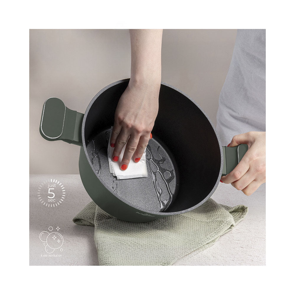 Kochen wird zum Vergnügen mit diesem 10-teiligen Kochgeschirr-Set. Die hochwertige Antihaftbeschichtung sorgt dafür, dass nichts anhaftet – so kannst du mit wenig Fett gesund braten. Das edle, matte Grün bringt Stil in deine Küche, während die ergonomischen Griffe für sicheren und bequemen Halt sorgen. Ob Induktion, Gas oder Elektro – das Set ist für alle Herdarten geeignet und unterstützt energiesparendes Kochen. Mit Töpfen, Pfannen und passenden Deckeln bist du für jede Mahlzeit bestens ausgestattet – vom schnellen Snack bis zum ausgiebigen Abendessen.