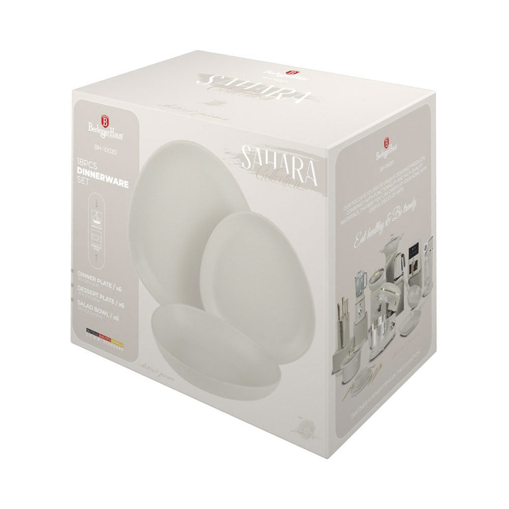 Das 18-teilige Tellerset der Sahara Collection von Berlinger Haus überzeugt durch sein hochwertiges Steingut und das elegante matte Design. Es bringt modernen Charme in deine Küche und eignet sich perfekt für den täglichen Gebrauch oder besondere Anlässe. Das Set umfasst verschiedene Tellergrössen, die sich ideal für alle Mahlzeiten eignen. Dank der spülmaschinenfesten Eigenschaft sparst du Zeit bei der Reinigung. Zudem ist das Set mikrowellengeeignet, sodass du deine Speisen bequem aufwärmen kannst. Verleihe deinem Tisch mit diesem Set einen stilvollen und zeitlosen Look., , Produktinformation, , Hochwertiges Steingut, Mattes Design, Spülmaschinenfest, Mikrowellengeeignet, , Lieferumfang, 6x Essteller: 30 x 27 x 3 cm, 6x Suppenteller: 23,6 x 21,5 x 5 cm, 6x Dessertteller: 23 x 21 x 2,5 cm