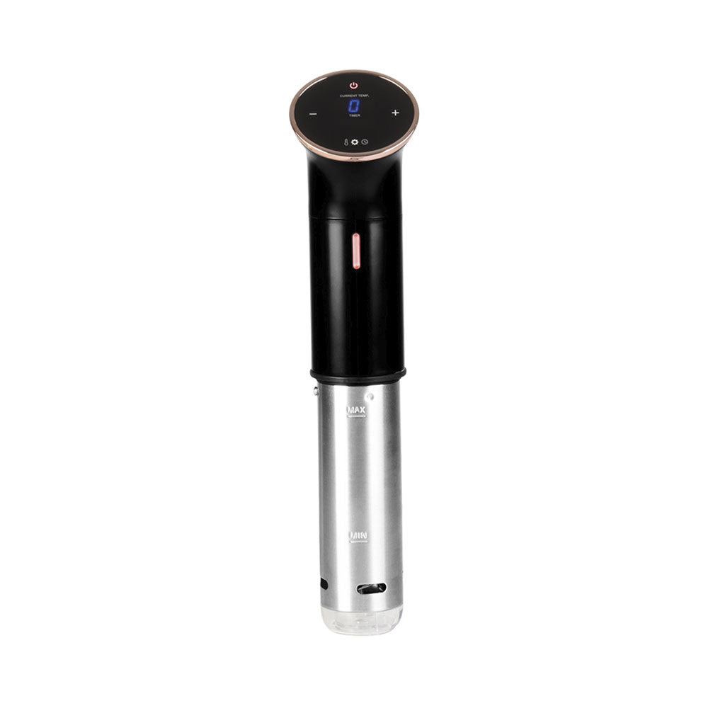Der Berlinger Haus Sous Vide Stab aus der eleganten Black Rose Collection bringt echte Küchenprofi-Qualität in den Alltag. Durch die präzise Temperatursteuerung gelingt Fisch, Fleisch oder Gemüse punktgenau – zart, saftig und auf den Punkt gegart. Eine LED-Anzeige ermöglicht die einfache Einstellung von Zeit und Temperatur, während der integrierte Timer auch lange Garprozesse bis zu 99 Stunden und 59 Minuten unterstützt. Die leistungsstarke Motorpumpe sorgt mit 8 Litern Wasserzirkulation pro Minute für gleichmässige Ergebnisse. Das Gerät ist nach IPX7 wasserdicht und arbeitet dabei besonders leise. Eine stilvolle und praktische Lösung für das moderne Sous Vide Garen.