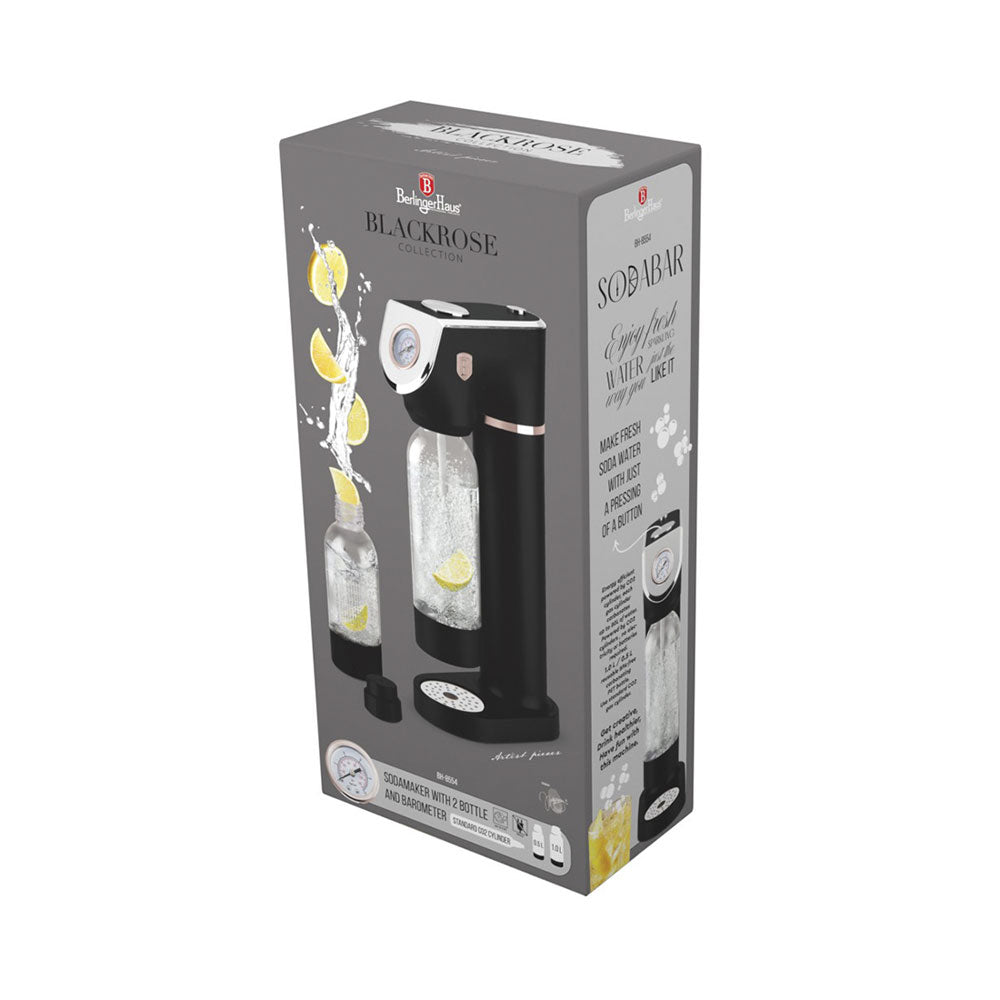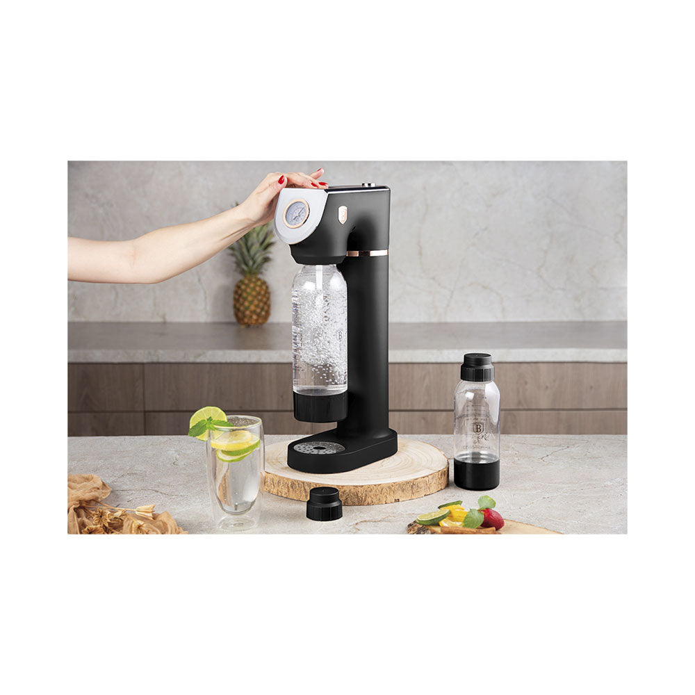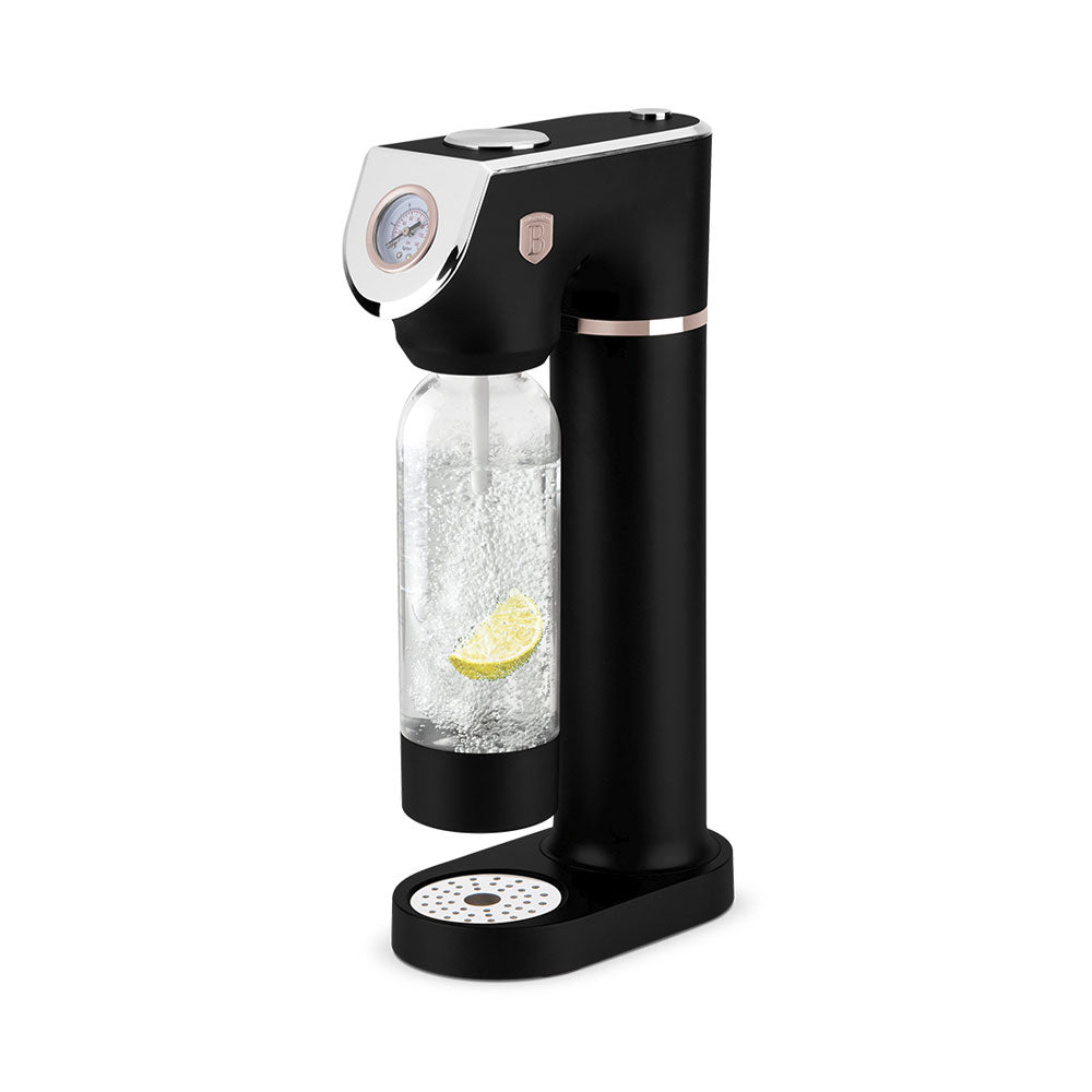 Der Berlinger Haus Wassersprudler aus der Black Rose Collection bringt frisches Sprudelwasser direkt zu Dir nach Hause – mit nur einem Knopfdruck. Du brauchst keinen Strom oder Batterien, um leckeres Sodawasser zu genießen. Einfach den Knopf für die Luftzufuhr drücken und schon entscheidest Du selbst, wie stark Dein Sprudel sein soll – von leicht bis kräftig, dank des integrierten Barometers. Die zwei Flaschen (1,0L und 0,5L) bieten Dir dabei maximale Flexibilität. Das elegante Design in mattschwarz mit rosegoldenen Akzenten passt in jede Küche. Die doppelte Sicherheitsdruckentlastung sorgt für saubere und sichere Handhabung. Umweltfreundlich, da Du Plastikmüll reduzierst!, , , Produktinformation, , 2 Flaschen: 1,0L und 0,5L, Universal, Standard-CO2-Flaschen (nicht enthalten), Barometer - Stufen von superleichtem bis starkem Sprudel, Doppelte Sicherheitsdruckentlastung