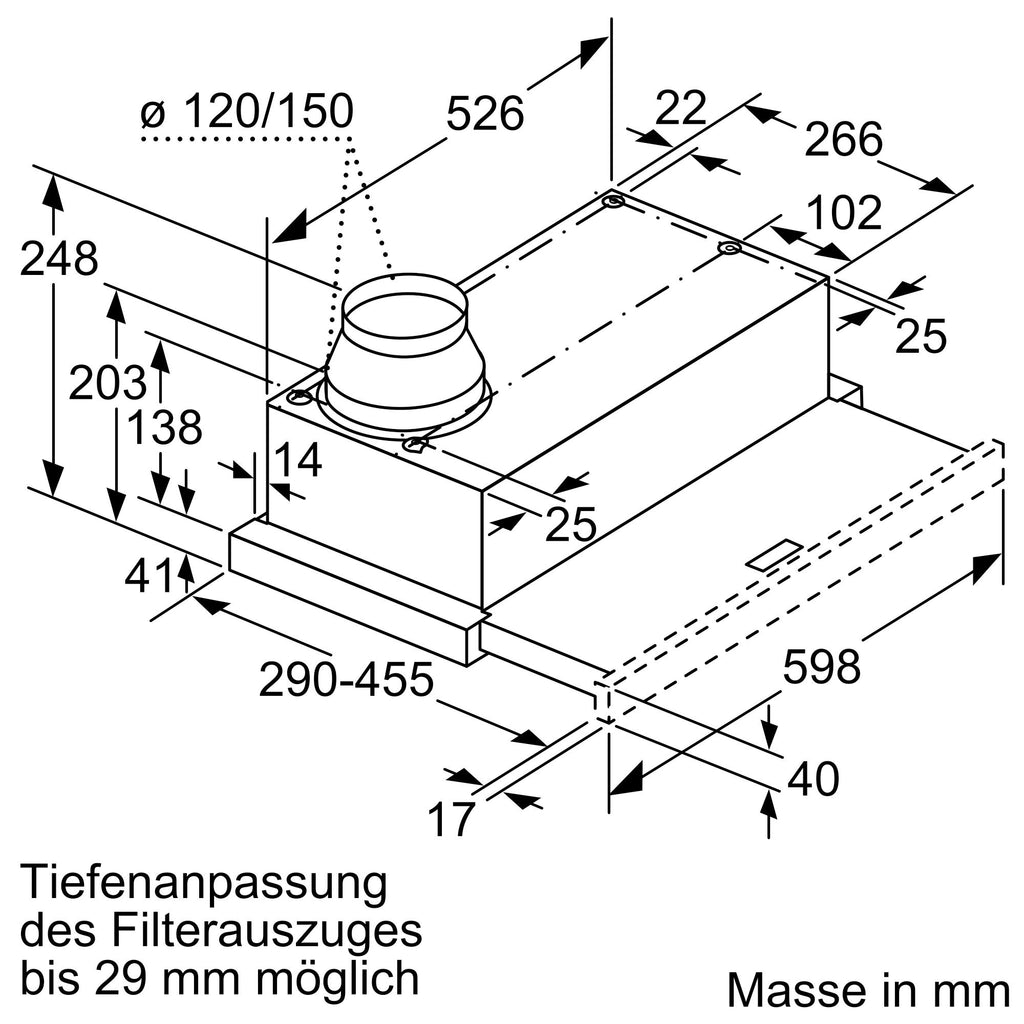 Für die optimale Ausleuchtung des Kochbereichs sorgen zwei integrierte Lampen. Die Flachschirmhaube ist für Abluft- und Umluftbetrieb geeignet und kann mit einem 120- oder 150-mm-Abluftstutzen angeschlossen werden. Mit einem Gewicht von 8 kg und einer kompakten Einbauhöhe von 203 mm ist die Haube platzsparend und vielseitig einsetzbar. Die Bosch Serie 4 Flachschirmhaube bietet damit eine stilvolle und funktionale Ergänzung für moderne Küchen.