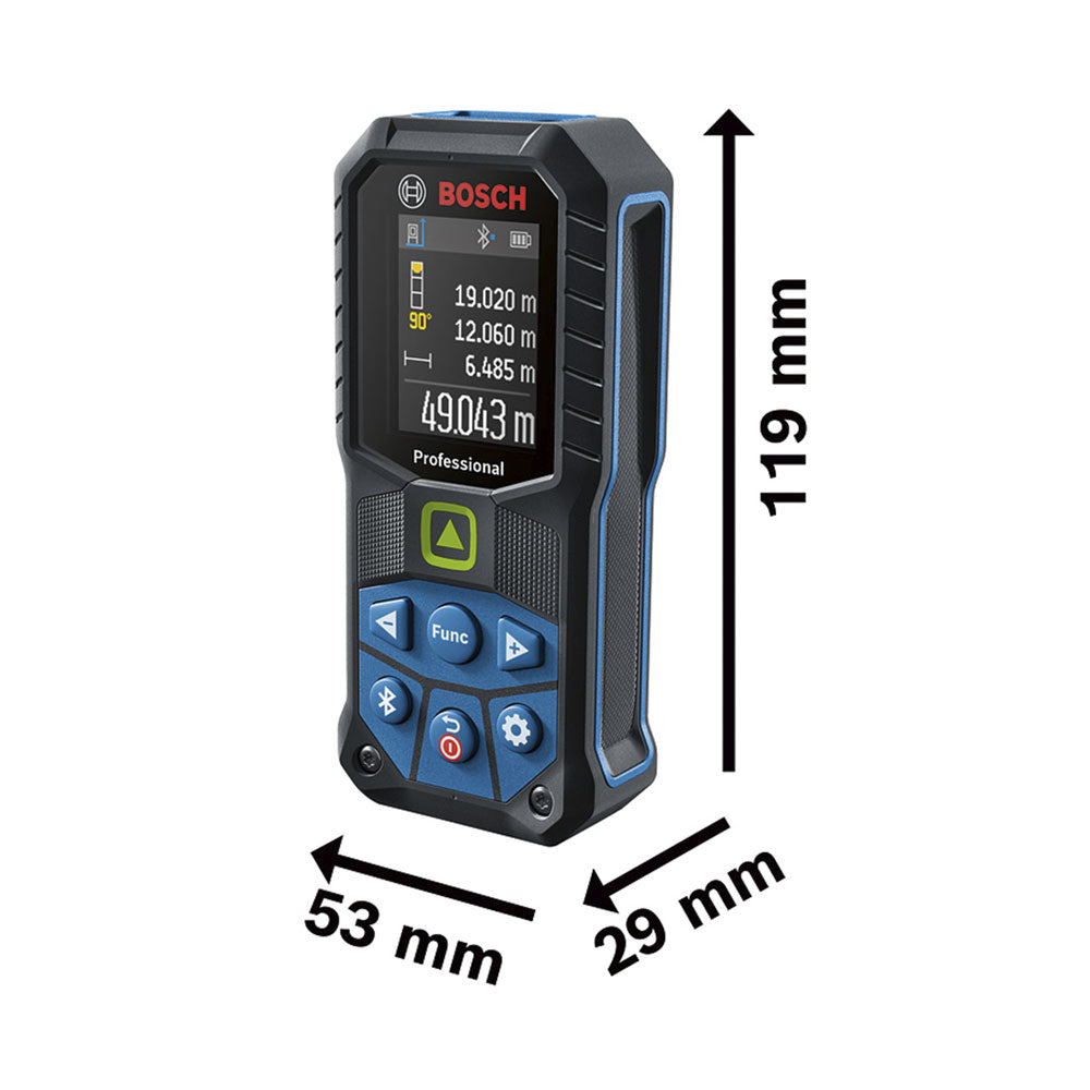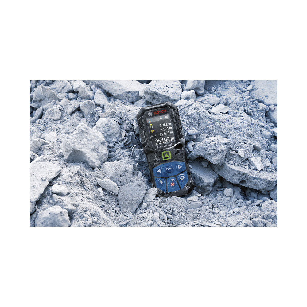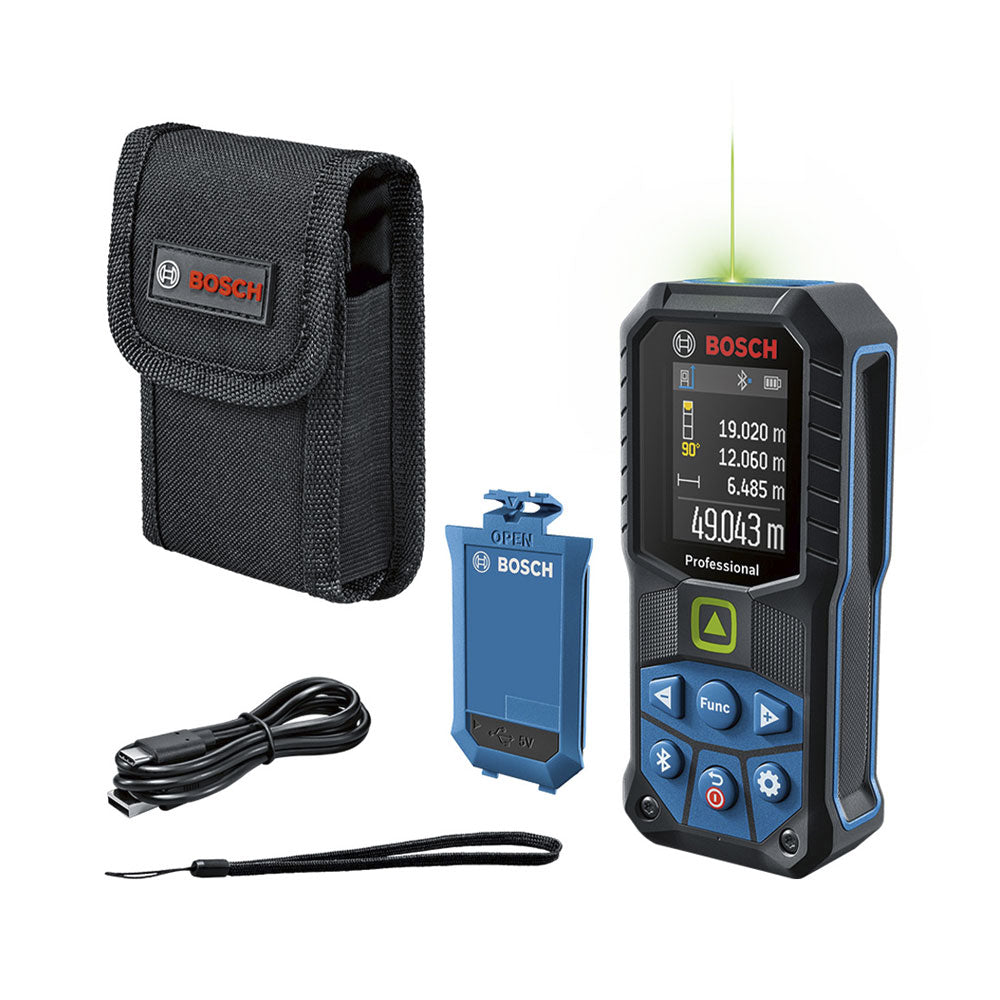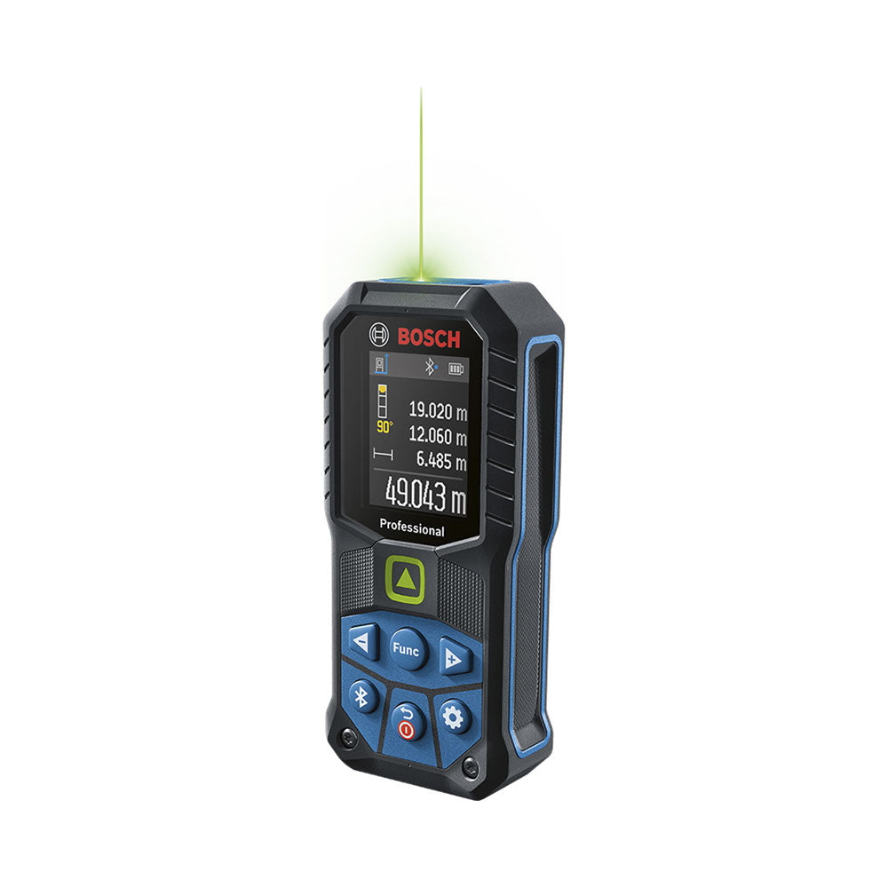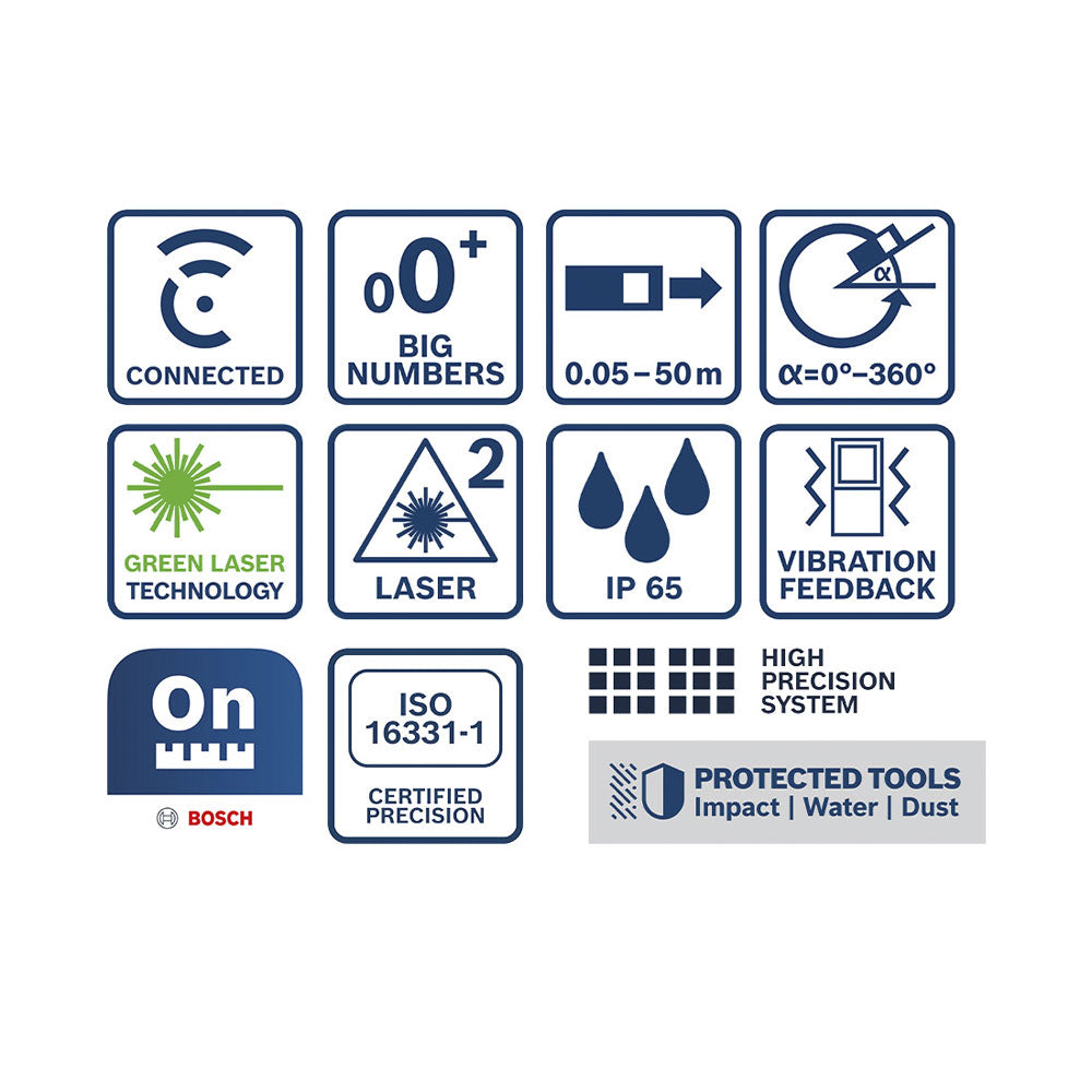 Mit dem Bosch GLM 50-27 CG Laserentfernungsmesser misst du schnell, präzise und zuverlässig. Der grüne Laser sorgt für exzellente Sichtbarkeit, selbst bei hellen Innenräumen oder grossen Distanzen. Robustes Design: sturzsicher bis 1,5 Meter, IP65-zertifiziert und mit stossabsorbierender Gummiummantelung – ideal für raue Baustellen. Dank Bluetooth®-Konnektivität und der Bosch MeasureOn App dokumentierst du Messdaten mühelos und überträgst sie direkt. Dein perfekter Helfer für anspruchsvolle Messarbeiten!, , , Produktinformationen, , Laserdiode: 515 Nm, Messbereich bis zu: 50 m, Laserklasse: 2, Stromversorgung: 2 x 1.5-V-LR6 (AA), Abschaltautomatik: 5 min, Anzahl Speicherwerte: 30, Laserfarbe: grün