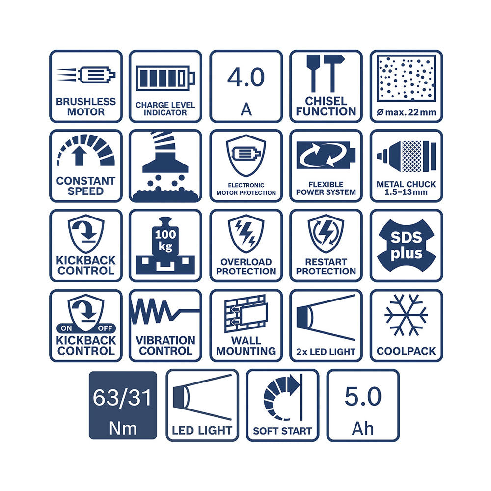 • Enthaltene Werkzeuge: GSR 18V Professional Akku-Bohrschrauber, GBH 18V Professional Bohrhammer, GWS 18V Professional Winkelschleifer.