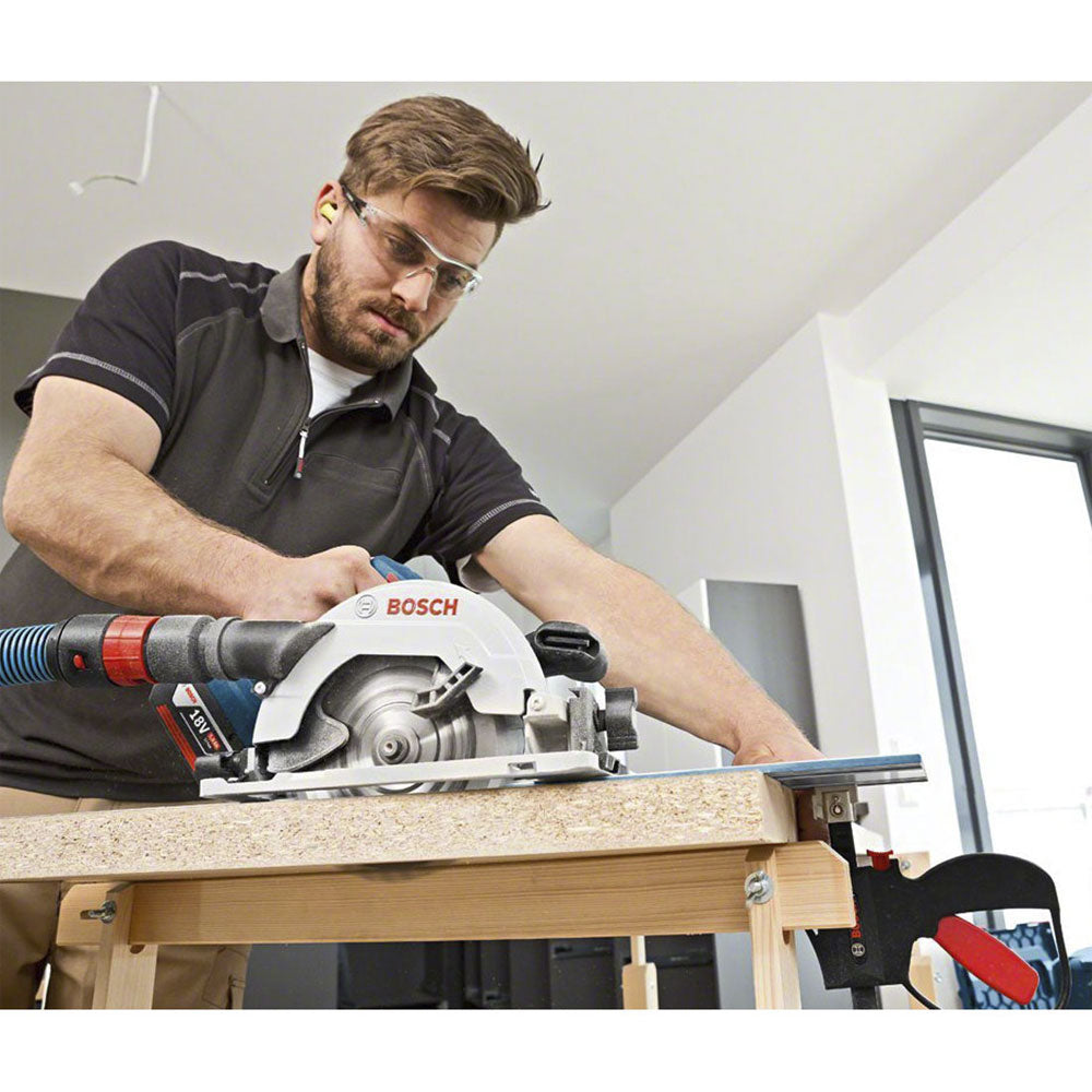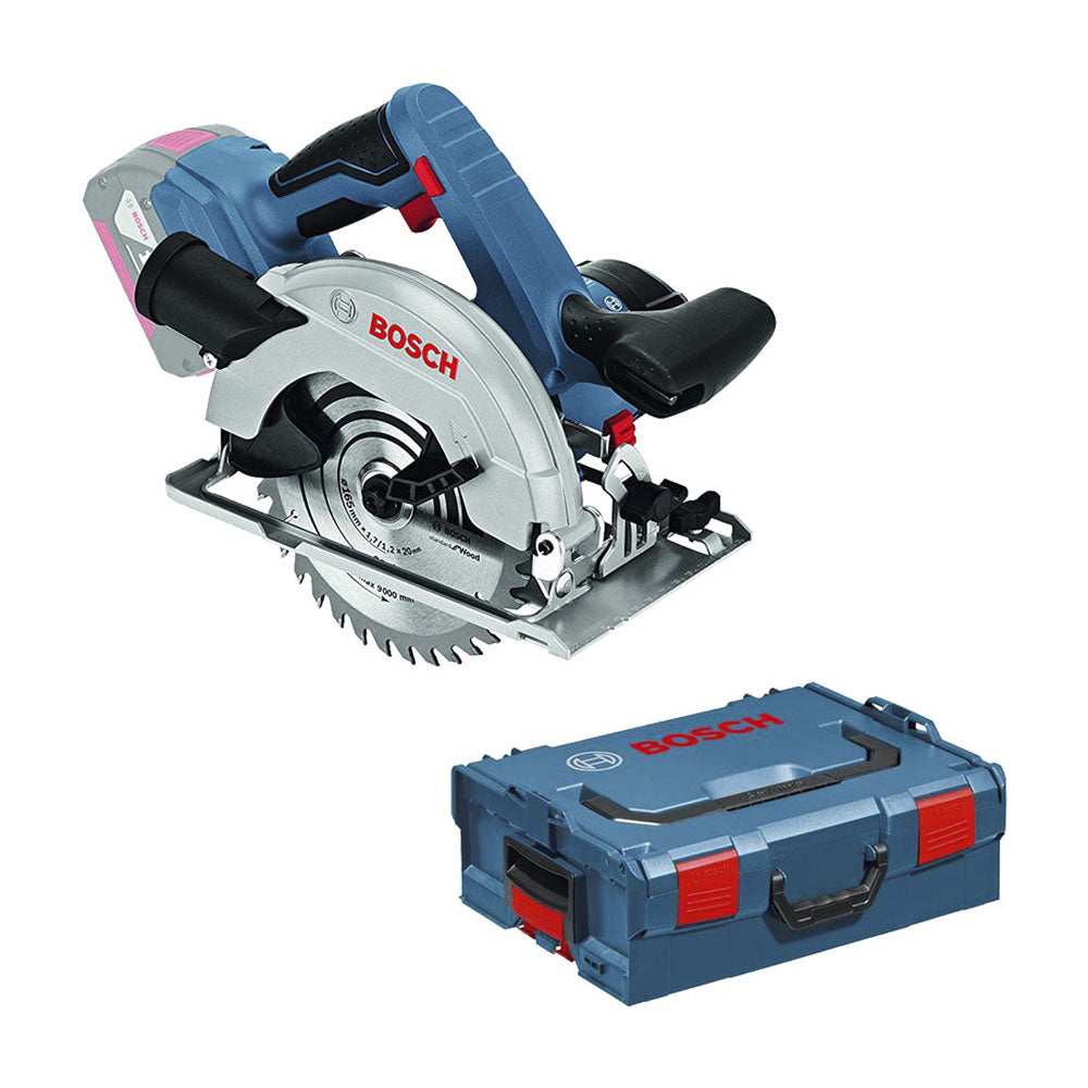 Die Bosch Kreissäge garantiert einen schnellen Sägefortschritt und eine lange Laufzeit dank des leistungsstarken Motors., , Das robuste Design wurde speziell für jede Art von Anwendungen auf der Baustelle entwickelt, selbst auf dem Dach und dem Gerüst sorgt die Kreissäge für einen schnellen Arbeitsfortschritt., , Durch den Einsatz der Führungsschiene wird ein flexibles und präzises Arbeitsergebnis ermöglicht. Die Kreissäge ist individuell anwendbar und kann auch mit dem Sägeblatt auf der rechten Seite verwendet werden., , , Produktinformation, , Geeignet für: Holz, Metall und Kunststoff, Sägeblattdurchmesser: 165 mm, Drehzahl max. 3'400 rmp, Betriebsart: Akkubetrieb 18 Volt, Kraftvoller Helfer für schnelle und akkurate Schnitte, Robustes Design geeignet für den Baustelleneinsatz, Hervorragende Sicht auf die Schnittlinie dank heller LED, Absaugadapter, Parallelanschlag und L-BOXX 238 inklusive, Ausstattung: Ohne Akku/Ladegerät