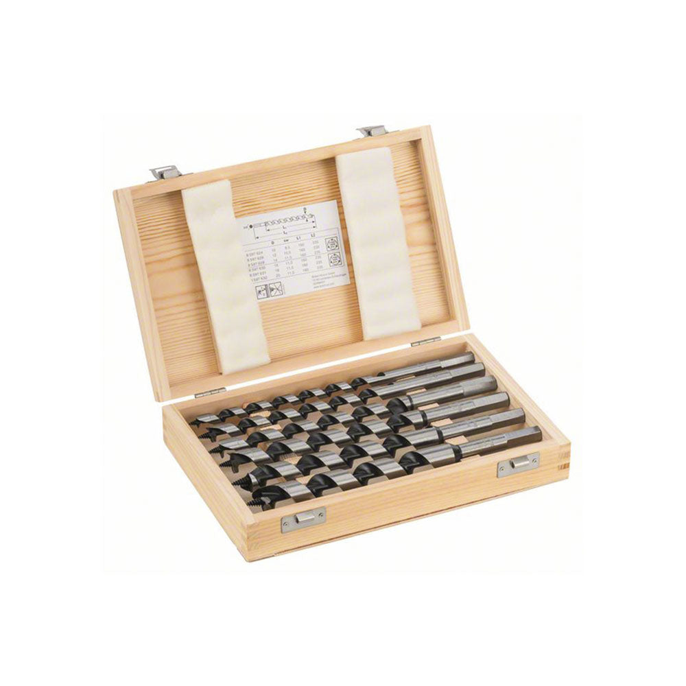Mit dem 6-teiligen Schlangenbohrer-Set von Bosch gelingen dir Durchgangslöcher, Vorbohrungen für Sparrennägel, Präzisionsbohrungen sowie das Bohren von tiefen Dübellöchern in Holz im Handumdrehen., , Rasche und angenehme Präzisionsbohrungen sind Dank der Hochleistungsspitze mit automatischem Vorschub ohne grossen Aufwand möglich., , Dank der geringen Reibung ist die optimierte Nutgeometrie des Bohrers in der Lage, gerade Löcher mit einer erhöhte Bohrgeschwindigkeit inklusive parallelem Abtransport der Späne, zu gewährleiten., , , Produktinformationen:, , Ideal für Zusatzverschalungen, für Schreiner und Dachdecker, in Weich- und Hartholz, Sechskant-Schaftsystem, Für alle Bohrschrauber mit 13-mm-Bohrfutter geeignet^, Vorritzer und die präzisionsgeschliffene Hauptschneidekante sorgen für exakte Bohrlöcher, , Technische Details:, , Durchmesser mm 10.0, Durchmesser mm 12.0, Durchmesser mm 14.0, Durchmesser mm 16.0, Durchmesser mm 18.0, Durchmesser mm 20.0, Arbeitslänge mm: 170, Gesamtlänge mm: 235, X-LOCK nein