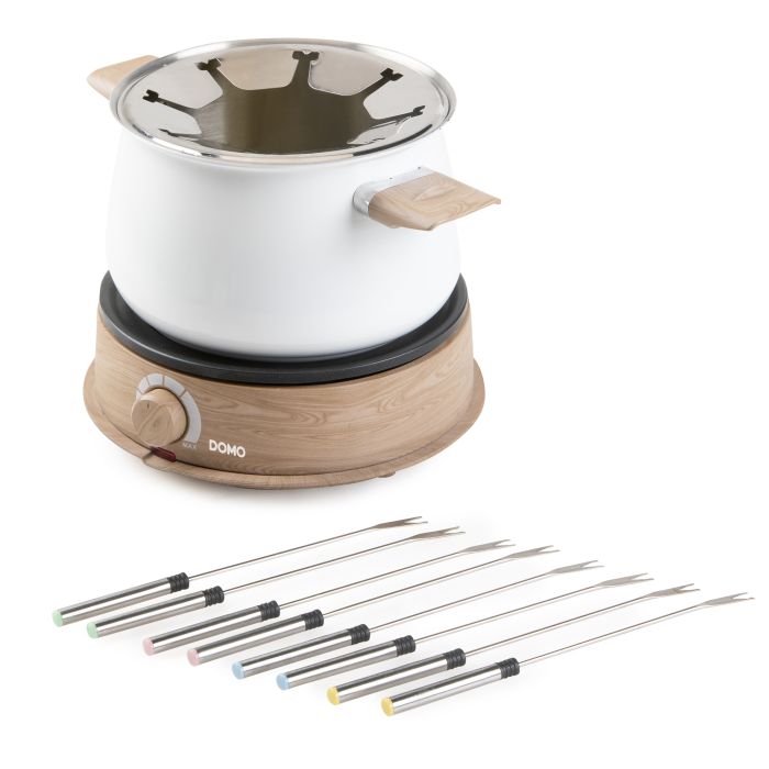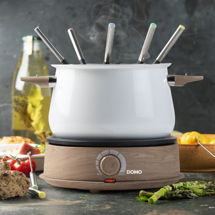 Das Fondue-Gerät DO736F von DOMO bietet mit seiner 2-Liter-Kapazität und einer leistungsstarken 1500-Watt-Heizung ausreichend Platz und Wärme, um köstliche Fondue-Kreationen für die ganze Familie oder Freunde zu genießen. Der einstellbare Thermostat mit Kontrolleuchte ermöglicht es, die Temperatur genau an Ihre Bedürfnisse anzupassen. Die stilvollen Griffe und der Sockel in Holzoptik verleihen dem Gerät ein elegantes Aussehen, das auf jedem Tisch eine gute Figur macht. Dank der rutschfesten Füße steht das Fondue sicher auf dem Tisch, während die acht farblich markierten Edelstahlgabeln für klare Zuordnung sorgen. Nach dem Genuss lässt sich das Gerät dank der integrierten Kabelaufbewahrung leicht und kompakt verstauen. Genießen Sie unvergessliche Momente und schaffen Sie leckere Erinnerungen mit diesem stilvollen Fondue-Set.