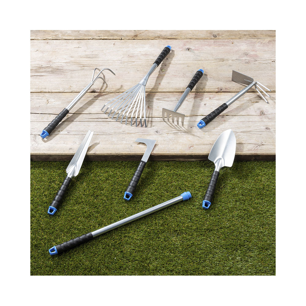 Mit dem FS-STAR 8-teiligen Gartenwerkzeug-Set hast du alles, was du für deine Gartenarbeit brauchst. Das praktische und vielseitige Set macht deine Gartenpflege nicht nur einfacher, sondern auch deutlich unterhaltsamer. Egal, ob du Unkraut jäten, Pflanzen umtopfen oder den Boden lockern möchtest – jedes Teil ist perfekt auf die Bedürfnisse von Hobbygärtnern abgestimmt. Wenn du gerne im Garten arbeitest, solltest du unbedingt passendes Werkzeug zu Hause haben. Dieses Set ist ideal für Einsteiger und eignet sich hervorragend als Starter-Set, um direkt durchzustarten. Hol dir das Set und verwandle deinen Garten in eine grüne Oase!, , , Produktinformationen, , Ideales Startet-Set für den Garten, Robust und langlebig, Gartenpflege leicht gemacht, , Lieferumfang, , 1 x Teleskopstiel, 1 x Handschaufel, 1 x Handrechen, 1 x Doppelkopf-Hacke, 1 x Handharke, 1 x Handgrubber, 1 x Unkrautvernichter, 1 x Fugenkratzer