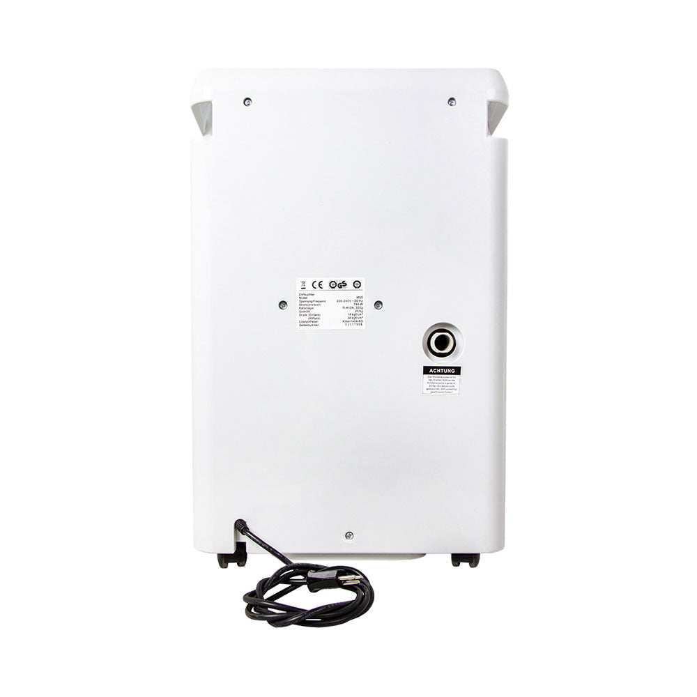 Produktinformation:, Geeignet für Räume bis 180 m³, Wasserbehälter: 8 Liter, Anzeige für "Behälter voll", Aktivkohlefilter, Anschlussmöglichkeit eines Schlauches um Kondenswasser direkt abzuführen, Feuchtigkeitsanzeige, Ein- Ausschalter, Timeranzeige, Abtauungsanzeige, Interne Hygrostat Entfeuchtungsleistung, Elektronischer Hygrostat, Automatische Ausschaltung bei vollem Behälter, Vereisungsschutz / automatische Abtauung durch Heissgas