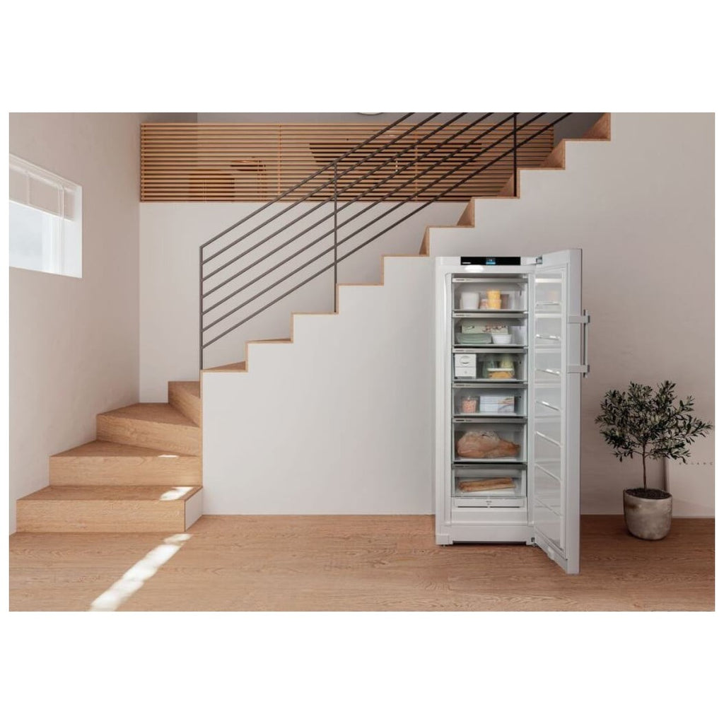 Der Gefrierschrank FNd 5056 ist ein leistungsstarkes Haushaltsgerät mit einer Gefrierleistung von 17 kg pro Tag und einem Gesamtnutzinhalt von 238 Litern, wovon der gesamte Platz zum Einfrieren genutzt wird. Mit einem Jahresverbrauch von 187 kWh und einer Geräuschentwicklung von 34 dB(A) ist dieser Gefrierschrank auch noch energieeffizient und angenehm leise im Betrieb. Der Temperaturbereich für das Einfrieren liegt zwischen -15°C und -28°C und dank der vibrationsarmen Kompressoren ist der Betrieb noch leiser und weniger störend. Zudem verfügt der FNd 5056 über die praktische Funktion "No Frost", die dafür sorgt, dass sich kein Eis im Gefrierschrank bildet und damit kein manuelles Abtauen notwendig ist. Eine weitere nützliche Funktion ist der Easy Ice Twist, mit welchen man ganz einfach und schnell Eiswürfel zaubern kann. Man füllt Wasser in den im Gefrierschrank vorhandenem Tank, lässts gefrieren und kann die Eiswürfel mit einer Drehung dann einfach lösen. Der Gefrierschrank verfügt auch noch eine Kindersicherung, die verhindert, dass Kinder den Gefrierschrank versehentlich öffnen und sich selbst oder andere gefährden. Mit einem Gewicht von 63.90 kg und den Gerätemassen von H 1'655mm, B 597mm und T 675mm, passt der FNd 5056 in nahezu jede Küche und bietet genügend Platz für eine Vielzahl von Lebensmitteln und Tiefkühlwaren.