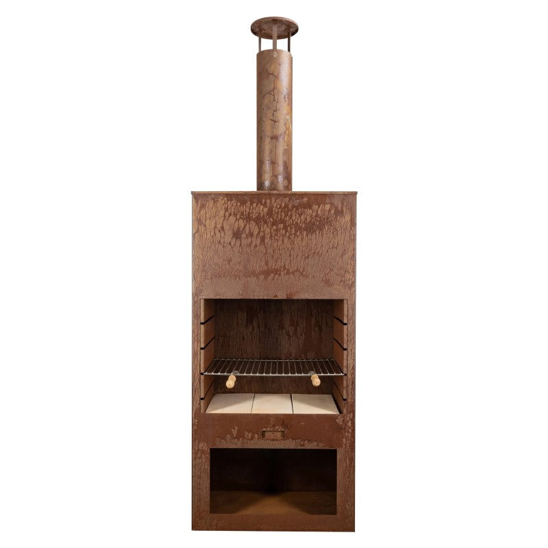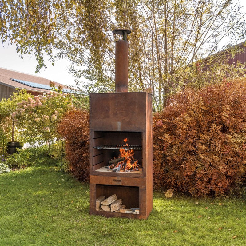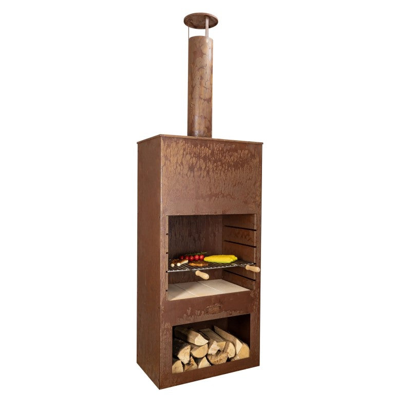 Das gerostete Cheminée Tubo ist ein echter Hingucker in jedem Garten. Der Grillrost bietet eine grosse Grillfläche. Ob Fleisch, Fisch oder Gemüse – das Cheminée Tubo ist ein echter Allrounder! Inkl. Holzaufbewahrung.