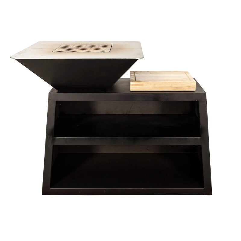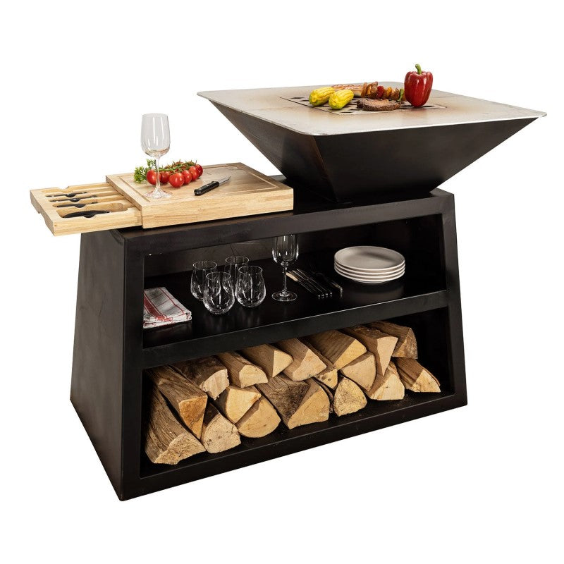 Feuer- und Grillstelle Duro Pro von Nouvel aus hochwertigem Cortenstahl mit Quadratischer Grillfläche aus Edelstahl. Inkl. Holzbrett mit ausziehbarer Schublade und BBQ-Messerset.