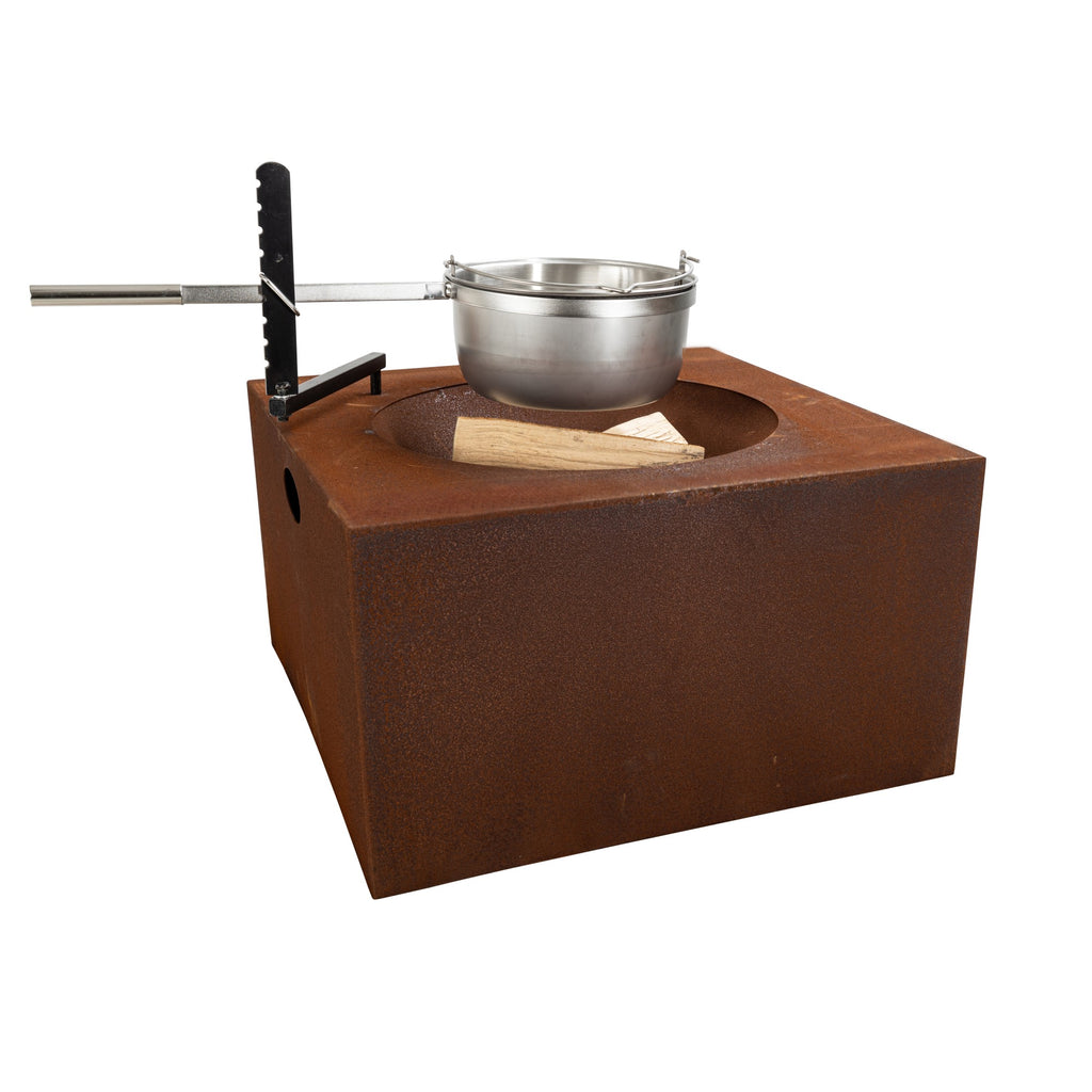 Die "Feuerstelle Piazza" vereint den Charme einer klassischen Feuerschale mit der Funktionalität eines Holzkohle Grill. Der Schwenkarm sitzt straff in der Hülse und ermöglich das Grillgut mit einem Handgriff optimal zu platzieren. Die Feuerstelle hat einen Wasserablauf und kann ganzjährig, ungeschützt draussen verbleiben.