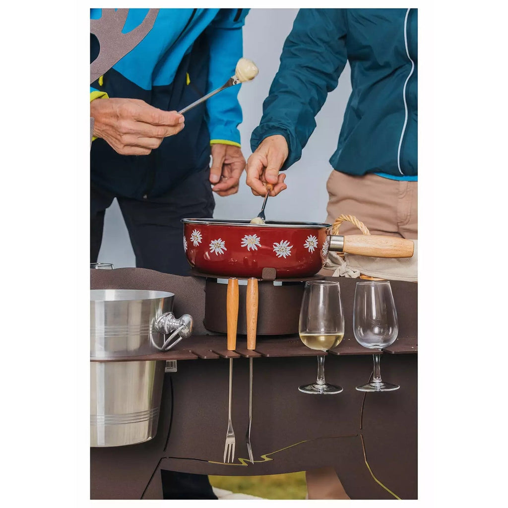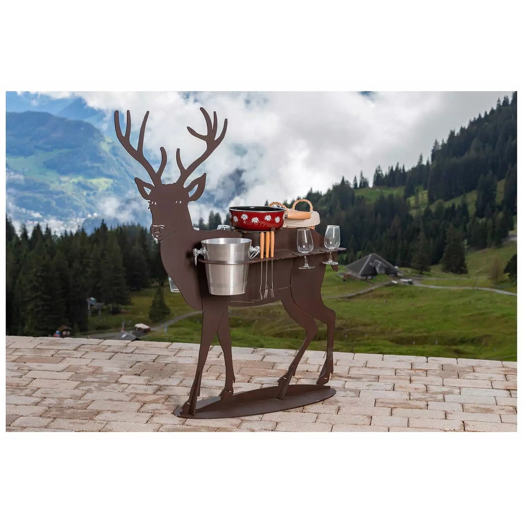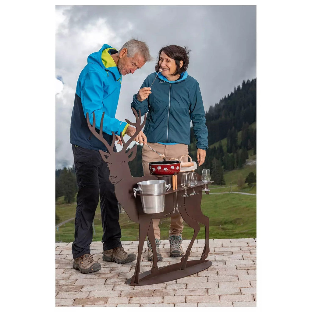 Die Fonduebar lässt mit ihrem Design und dem umfassenden Zubehör keine Wünsche offen. Im Lieferumfang enthalten ist alles, was für einen gemütlichen Fondueplausch verwendet werden muss. Die Bar ist aus stabilem, beschichtetem Stahl gefertigt und mit diversen Halterungen versehen. Zudem gehört das passende Caquelon, 1 Thermo Fire Gasbrenner, 12 Fonduegabeln und ein passender Brotkorb dazu. Der integrierte Weinkühler rundet das vorhandene Zubehör ab. Geniessen Sie mit der Fonduebar im Hirsch Design mit Ihren Liebsten gemütlichen Fondueplausch an der frischen Luft.