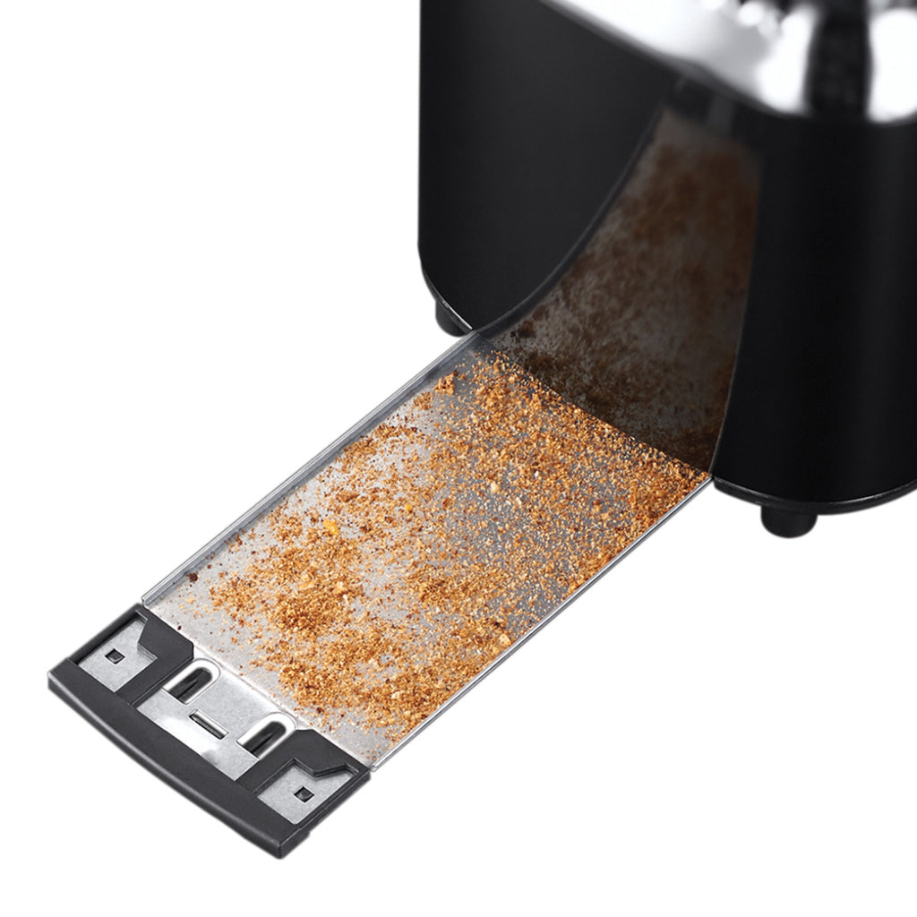 Die Retro Classic Noir Frühstücksserie von Russell Hobbs verbindet zeitloses Design mit moderner Technologie von heute. Ganz im Stil der 50er Jahre, ohne jedoch auf moderne Technik zu verzichten, sorgt diese Serie für ein ganz besonderes Flair in der Küche. Der Retro Classic Noir Toaster überzeugt mit der stylischen Retro Countdown-Anzeige, die die verbleibende Röstdauer des Toastes anzeigt und der Schnell-Toast-Technologie für ein schnelleres Toasten. Darüber hinaus zeichnet sich der Toaster durch 6 einstellbare Bräunungsstufen und der „Lift and Look“-Funktion aus.