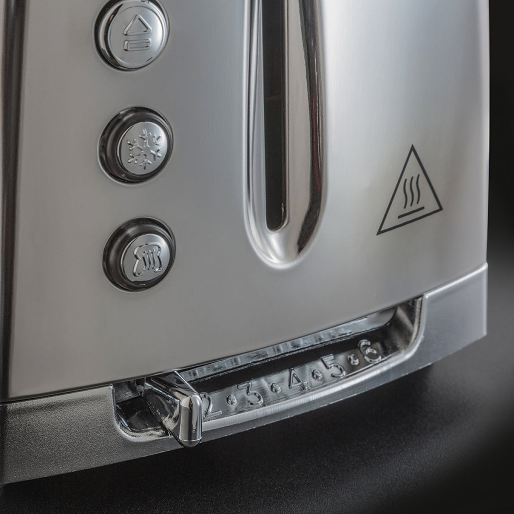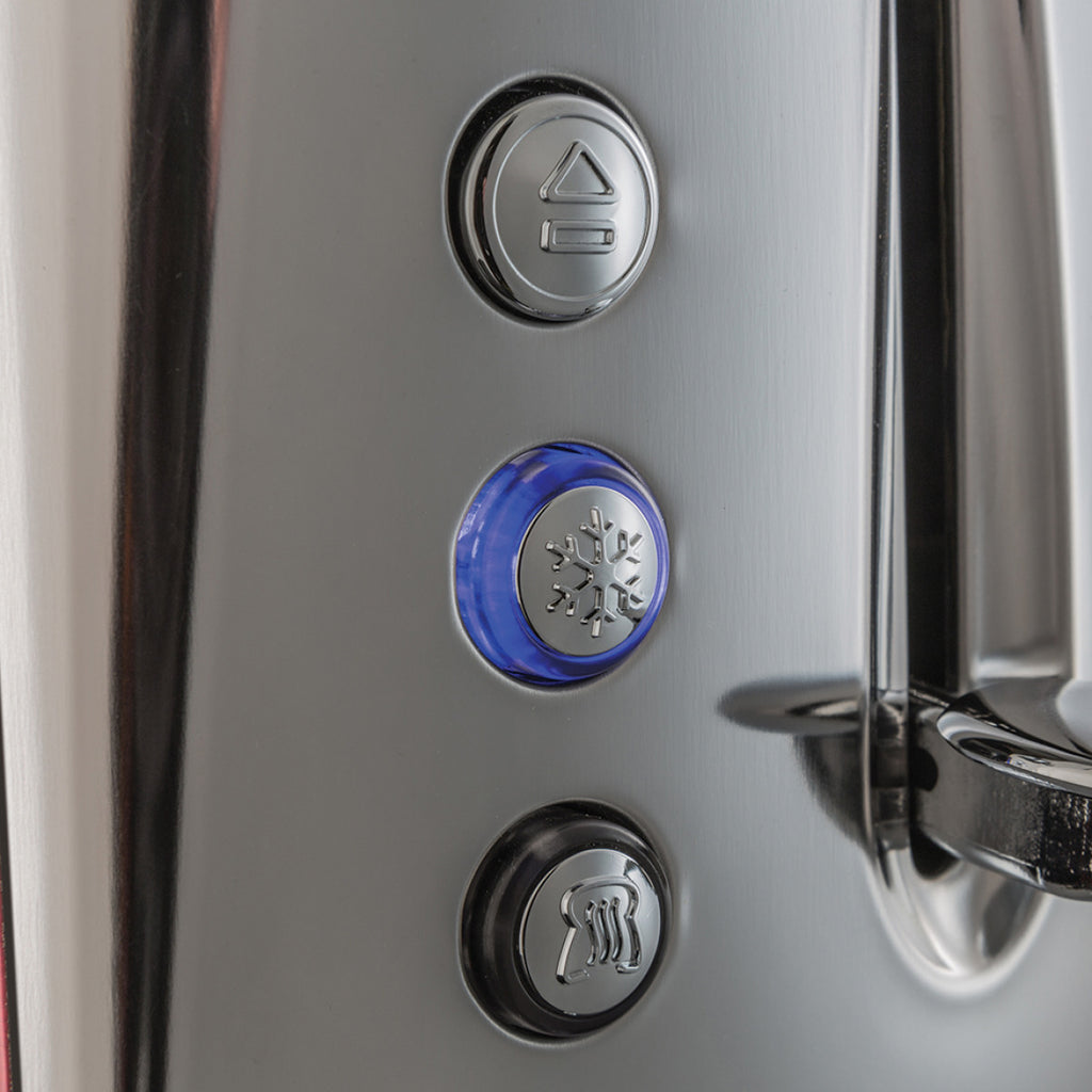 Inspiriert vom Glanz des Mondes entstand die Luna Solar Red Frühstücksserie. Sie kombiniert polierten Edelstahl mit einer hochwertigen, fingerabdruckresistenten Lackierung. Diese Serie besticht zusätzlich durch moderne Ausstattungsmerkmale und ist ein Eyecatcher in jeder Küche. Der Luna Solar Red Toaster mit 1.550 Watt Leistung ermöglicht dank der Schnell-Toast-Technologie ein bis zu 55 % schnelleres Toasten. Die integrierte „Lift and Look“-Funktion erlaubt zudem ein Anschauen des Toastes während des Röstens, ohne den Vorgang zu unterbrechen. Für einen individuell wählbaren Röstgrad ist das Gerät mit sechs Bräunungsstufen ausgestattet. Der Toaster ist darüber hinaus mit einem Brötchenaufsatz, einer Stopp-, Auftau- und Aufwärmfunktion sowie einer praktischen Krümelschublade ausgestattet. Im Vergleich zum Russell Hobbs Jewels Ruby Red Toaster