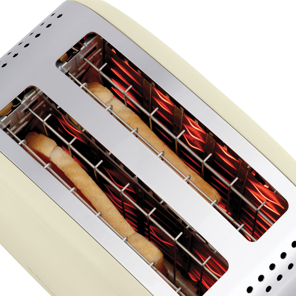 Der Colours Plus+ Toaster überzeugt durch sein Design in hochwertig lackiertem Edelstahl. Der Colours Plus+ Toaster in diversen Farben mit 2 extra breiten Toastschlitzen verfügt über 6 Bräunungsstufen und bietet mit Stopp-, Aufwärm-, und Auftaufunktion sowie einem Brötchenaufsatz alle wichtigen Ausstattungsmerkmale für leckeren Toast und einen genussvollen Start in den Tag. Die "Lift and Look"-Funktion des 1.600 Watt Toasters ermöglicht ausserdem ein Anschauen des Toasts während des Röstens, ohne den Vorgang zu unterbrechen und die Hebefunktion sorgt zusätzlich für die sichere Entnahme der Brotscheiben.