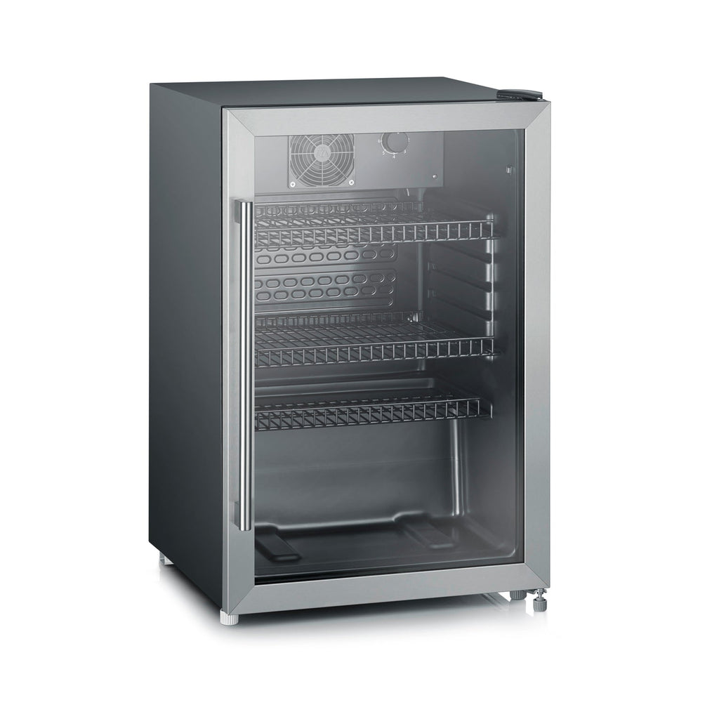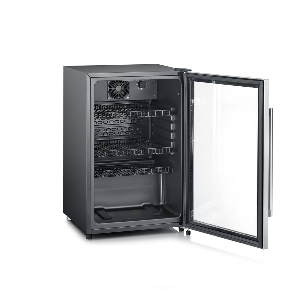 Stilvoller Getränke- oder Weinkühlschrank FKS8840 der Marke Severin, in schwarzem Design mit Glastür und Gitterablagen.
