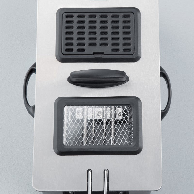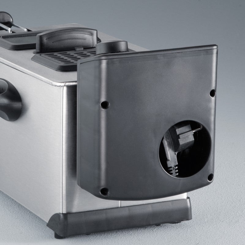 Mit dem auswechselbaren Fettfilter und dem herausnehmbaren Frittierkorb sowie Fettbehälter lässt sich diese Fritteuse nicht nur leicht nach dem Baukastenstecksystem zusammenbauen, sondern ist auch bestens für eine leichte Reinigung geeignet. Zudem sind der Frittierkorb und der Fettbehälter spülmaschinengeeignet. Der Staubschutzdeckel aus Edelstahl dient zum einen dem sicheren Schutz vor spritzendem Fett und bietet zum anderen die Möglichkeit, den Frittiervorgang durch das Sichtfenster stets im Auge zu behalten. So sind Sie stets geschützt und können das Anbrennen des Frittierguts vorhindern. Frittieren Sie in einem Durchgang bis zu 400 g und reinigen Sie ihn leicht im Nachhinein in der Spülmaschine. Verstauen Sie den praktischen Küchenhelfer platzsparend und nutzen Sie die Kabelaufwicklung um dem Kabelwirrwarr im Schrank ein Ende zu bereiten.
