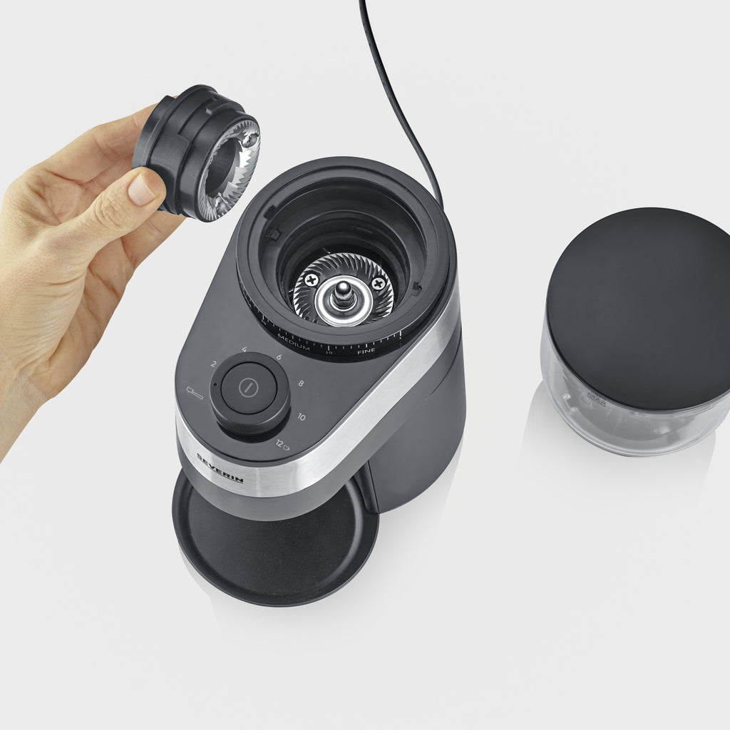 Die Severin Kaffeemühle KM3880 vereint modernes Design mit professioneller Technik für ein perfektes Mahlergebnis. Dank aromaschonendem Scheibenmahlwerk aus Edelstahl und individuell einstellbarem Mahlgrad geniessen Sie stets frisch gemahlenen Kaffee – genau so, wie Sie ihn bevorzugen.