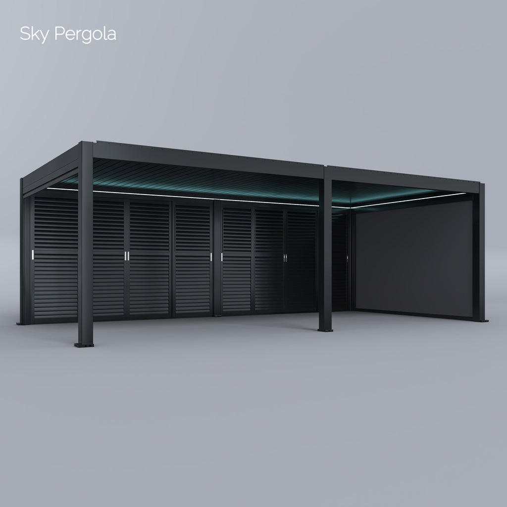 Welcome to the unveiling of our latest product series, the Pergola Skymax Ultra line, which inspires with its impressive design, illuminated slats and motorized functionality. As the ultimate high-end product, the Skymax Ultra line sets new standards in terms of elegance and innovation in our range. With this first -class pergola you can immerse yourself in a world full of luxury and comfort and enjoy incomparable outdoor moments.