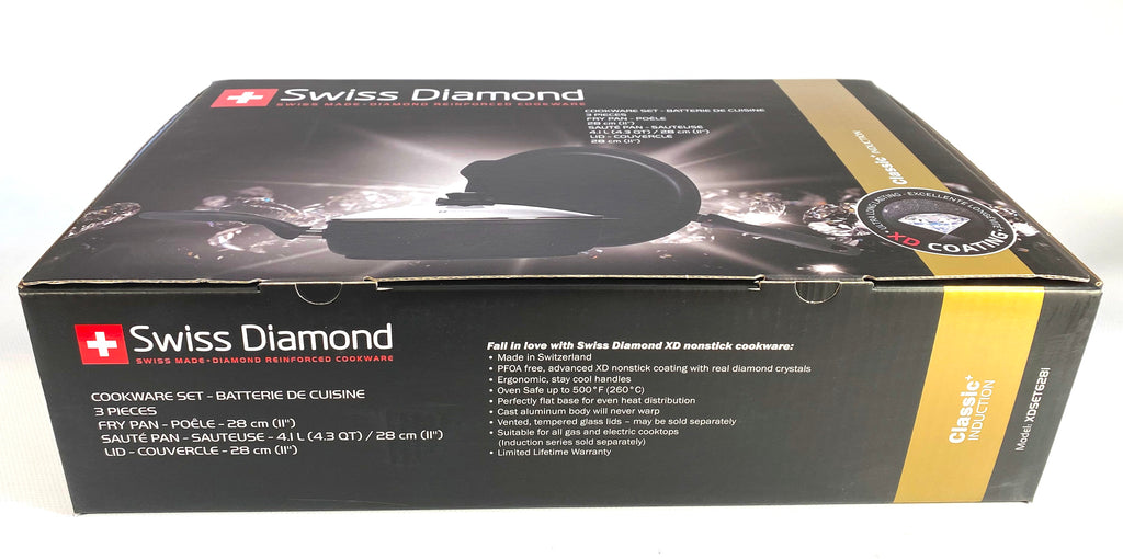 Dieses dreiteilige Induktionsset von Swiss Diamond ist mit der XD Beschichtung auf jeder Pfanne versehen, die 20 Prozent mehr Diamanten enthält als die vorherige Swiss Diamond HD Beschichtung. Diese neue Beschichtung sorgt dafür, dass kein Schrubben oder Einweichen nötig ist – die Antihafteigenschaften lassen Lebensmittelreste direkt von der Pfanne gleiten. Die Rezepturen für Swiss Diamond Antihaftbeschichtungen bieten die gleiche Premiumqualität, die Köche weltweit zu schätzen gelernt haben. Das, gepaart mit dem modernen Design, macht es zu einer wunderbaren Wahl für jede Küche.Das Set enthält:Bratpfanne Induktion 28cmSauteuse Induktion 4.2l / 28cmDeckel 28cm (passend für beide)Jede Pfanne ist aus Aluminiumguss gefertigt – das bedeutet, dass sich die Pfanne niemals verformt oder verbiegt. Jedes Stück ist bis 260°C (500°F) backofenfest, so dass das Übertragen Ihrer Bratpfanne oder Sauteuse vom Backofen auf den Herd sehr einfach ist. Der Glasdeckel verfügt zudem über einen leicht zu greifenden Knopf mit verstellbarem Dampfablass. Mit dieser Funktion können Sie überwachen, wie Ihre Gerichte kochen, ohne die dringend benötigte Feuchtigkeit entweichen zu lassen. Bewegen Sie sich souverän und entspannt in der Küche mit dem klassischen Kochset.