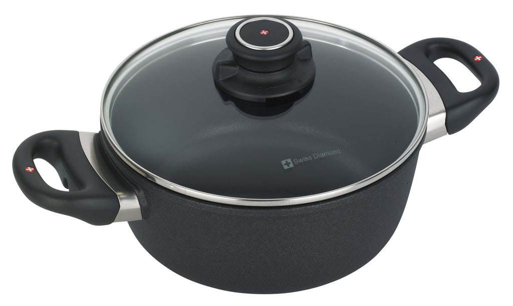 Das PFOA-freie Kochgeschirr von Swiss Diamond bietet unübertroffene Antihaft-Eigenschaften für gesundes Kochen und schnelles Reinigen. Und jetzt hat Swiss Diamond seine revolutionäre Diamantbeschichtung noch verbessert. Diese Pfanne ist mit unserer neuen XD-Antihaftbeschichtung ausgestattet, die 20 Prozent mehr Diamantkristalle enthält und damit die Haltbarkeit und Antihafteigenschaften der Pfanne insgesamt verbessert. Mit dieser robusten 20 cm (2,1L) Swiss Diamond Antihaft-Kasserolle können Sie ein einziges Kochgeschirr von der Herdplatte in den Ofen und auf den Tisch bringen. Dank hochwertiger europäischer Handwerkskunst brennt das Swiss Diamond Induktionskochgeschirr garantiert nicht auf Ihrer Herdplatte.Die mit echten Diamantkristallen verstärkte XD-Antihaftbeschichtung garantiert ein sofortiges Lösen von hartnäckigen Speiseresten mit nur warmer Seifenlauge. Kein stundenlanges Schrubben oder Einweichen nach dem Festtagsessen mehr! Die Griffe sind sicher befestigt und bieten die Stärke von Nieten, ohne dass sich Bakterien ablagern können. Außerdem ist diese Pfanne bis zu 260°C (500°F) backofenfest, d.h. sie kann problemlos vom Ofen auf die Herdplatte übertragen werden. Der dicke, gegossene Aluminiumkörper hat einen perfekt flachen Boden, der sich beim Kochen oder Backen nicht verzieht oder kippt.Zusätzlich ist diese Kasserolle für gesunden Komfort konzipiert, dank der Swiss Diamond XD-Beschichtung, die das Kochen ohne Öl ermöglicht, ideal für jahrelange gesunde Ernährung. Große Familienessen, Festtagsaufläufe und große Fleischstücke können dank dieser wunderbaren Mehrzweck-Induktionskasserolle ganz einfach zubereitet werden.Merkmale:Hergestellt mit einer Aluminiumbasis20% mehr echte Diamantkristalle in der BeschichtungDie Antihaftbeschichtung sorgt für gesundes KochenDer robuste Sockel verhindert das Verziehen, Kippen oder DrehenErhöhte Lebenserwartung durch Antihaftbeschichtung im Vergleich zu anderen KochgeschirrserienKochen Sie bei niedriger bis mittlerer Hitze, um aussergewöhnliche Ergebnisse zu erzielenEs ist nicht notwendig, mit Öl zu kochenGleichmässige WärmeverteilungEnergieeffizientÜberlegene HaltbarkeitÜberlegene Freisetzung von LebensmittelnGeeignet für Gas-, Elektro-, Strahlungs-, Keramik-, Halogen- und InduktionskochfelderOfensicher bis 260°C (500°F)Geschirrspülmaschinenfest; von Hand abwaschen empfohlenHergestellt in der Schweiz