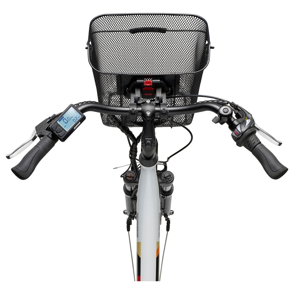 Das Telefunken City-Pedelec RC822 überzeugt vor allem mit seinem leistungsstarken Frontmotor, welcher im Zusammenspiel mit dem ausdauernden Akku eine Reichweite von bis zu 100 km ermöglicht und Sie damit auch auf längeren Strecken zuverlässig unterstützt. Der Sitzrohrakku ist nicht nur besonders leistungsstark, sondern fällt durch die geschickte Positionierung auch optisch weniger auf und verbessert durch einen tiefen Schwerpunkt zudem das Fahrverhalten. Das kompfortable E-Bike ist mit dem Tiefeinsteiger-Rahmen und dem abnehmbaren Einkaufskorb eben ein echtes Multitalent. Mit der 7-Gang Shimano Kettenschaltung finden Sie für jedes Terrain die passende Übersetzung und erreichen stets schnell und entspannt Ihr Ziel. Ein modernes LCD-Display versorgt Sie während der Fahrt mit allen wichtigen Informationen, wie z.B. der Geschwindigkeit und der zurückgelegten Strecke. Erleben Sie entspannte Radtouren dank dem umfangreichen Komfort-Paket bestehend aus City Komfort Sattel, Lenker mit ergonomischen Griffen, praktischem Einkaufskorb und Gepäckträger.