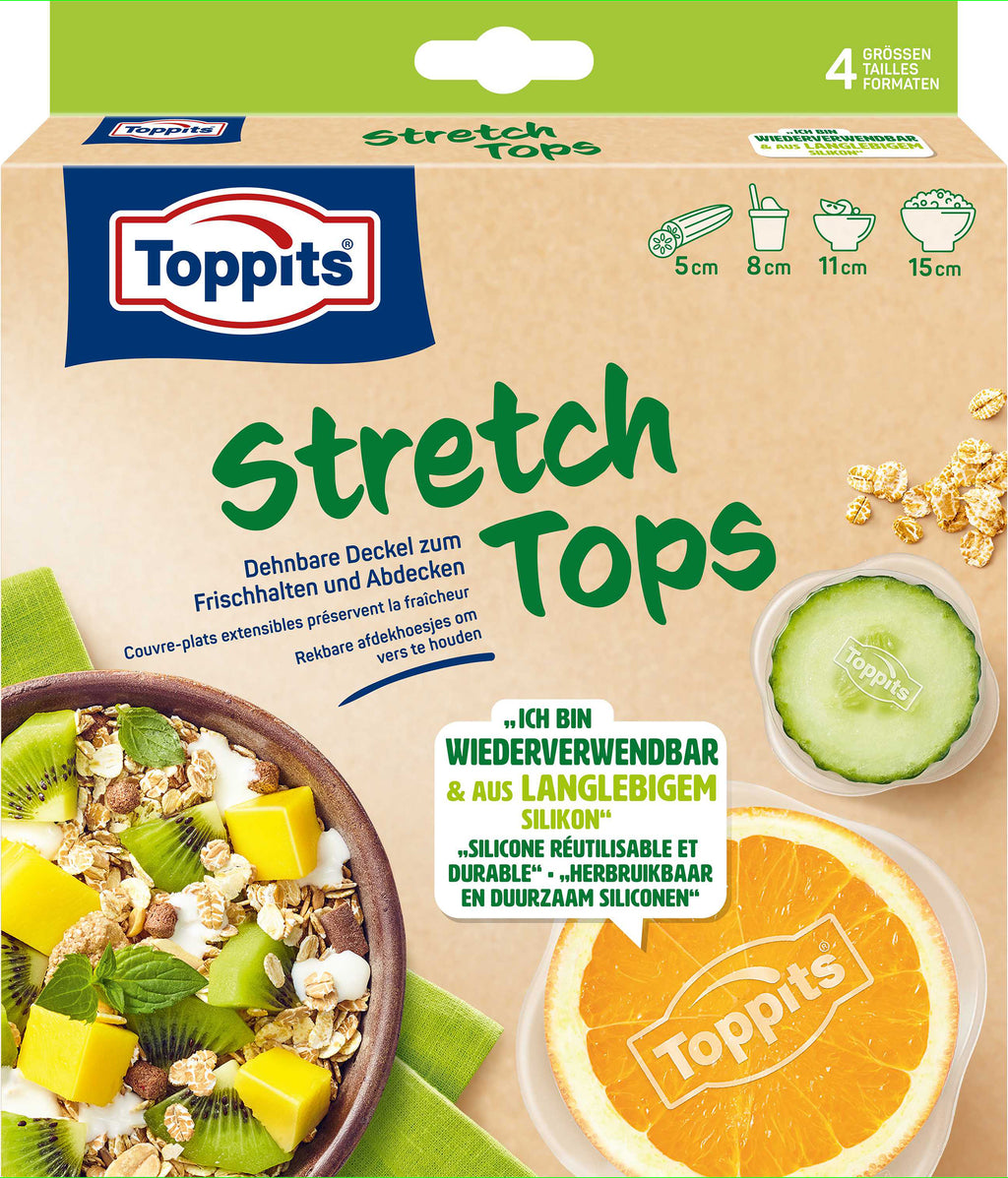 In der Farbe Transparent aus Silikon4 StückGefrier- und hitzebeständigStapelbarAuslauffestDie Stretch Tops von Toppits sind frei von Einwegplastik hergestellt und bieten eine wieder verwendbare Alternative zu Einwegdeckeln sowie Frischhaltefolie und sind der flexible Küchenhelfer zum Abdecken von angeschnittenem Obst und Gemüse sowie Essensresten in Schüsseln oder Gläsern oder angebrochenen Joghurtbechern.Aus langlebigem MaterialSie sind aus dehnbarem und langlebigem Silikon in Lebensmittelqualität gefertigt. Das dezente und zeitlose Design und die griffige, rutschfeste Haptik machen die Silikondeckel zu einem praktischen täglichen Küchenwerkzeug. Jedes Lebensmittel, von einer kleinen Zwiebel bis hin zum halben Kürbis, kann mit einem Silikondeckel abgedeckt werden, um es länger frisch zu halten.Gefrier- und hitzebeständigDie Silikondeckel können in kalter Umgebung, einem Kühl- oder Gefrierschrank, sowie auch Hitze ausgesetzt beim Aufwärmen von Speisen in der Mikrowelle, verwendet werden. Die Silikondeckel sollen hierbei locker aufgelegt werden, so verhindern sie, dass Gerichte wie Suppen beim Erhitzen spritzen. Nach dem Gebrauch kann der Silikondeckel entweder unter heissem Wasser mit etwas Spülmittel abgespült oder in die Spülmaschine gegeben und gereinigt werden. Er ist innerhalb kürzester Zeit für den nächsten Einsatz bereit.StapelbarEin weiterer Vorteil: Alles, was mit einem Silikondeckel abgedeckt ist, ist stapelbar und kann somit platzsparend verstaut werden. Mit Hilfe von Silikondeckeln können Gerüche während der Aufbewahrung von Speisen und aromareiche Lebensmittel wie Zwiebeln reduziert werden. Somit gehören hartnäckige Gerüche, die sich im Kühlschrank festsetzen können, der Vergangenheit an.AuslauffestDarüber hinaus verhindern die Silikondeckel das Auslaufen von Flüssigkeiten. So wird das Aufbewahren von flüssigen Lebensmitteln wie einem Smoothie sicher und einfach. Ausserdem verhindern Silikondeckel das Austrocknen von Lebensmitteln wie zum Beispiel Tomaten und Gurken oder saftigem Obst wie Orangen.WiederverwendbarWiederverwendbare Produkte zeichnen sich aus durch Mehrfachverwendung und Langlebigkeit. Gängige Einwegprodukte aus dem alltäglichen Leben können so durch wiederverwendbare Alternativen sinnvoll ersetzt werden. Diese müssen auch nach mehrfachem Gebrauch nicht weggeworfen werden.