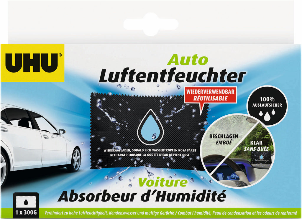UHU Auto Luftentfeuchter 300gperfekt für beschlagene Scheiben & Feuchtigkeitsprobleme imAuto, 100% auslaufsicher, wiederverwendbar durch Wiederauf-ladung in der Mikrowelle, ideal für Auto, Wohnwagen, Boote,Wohnmobile etc.