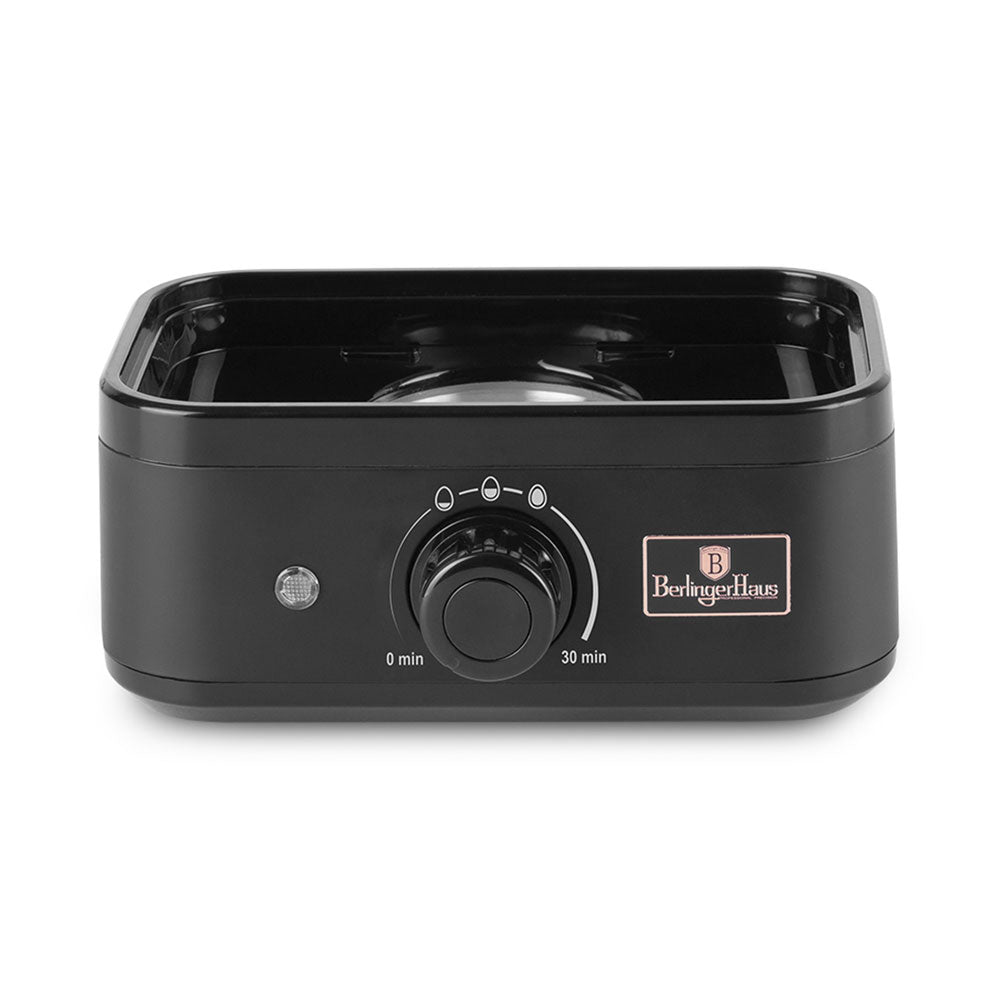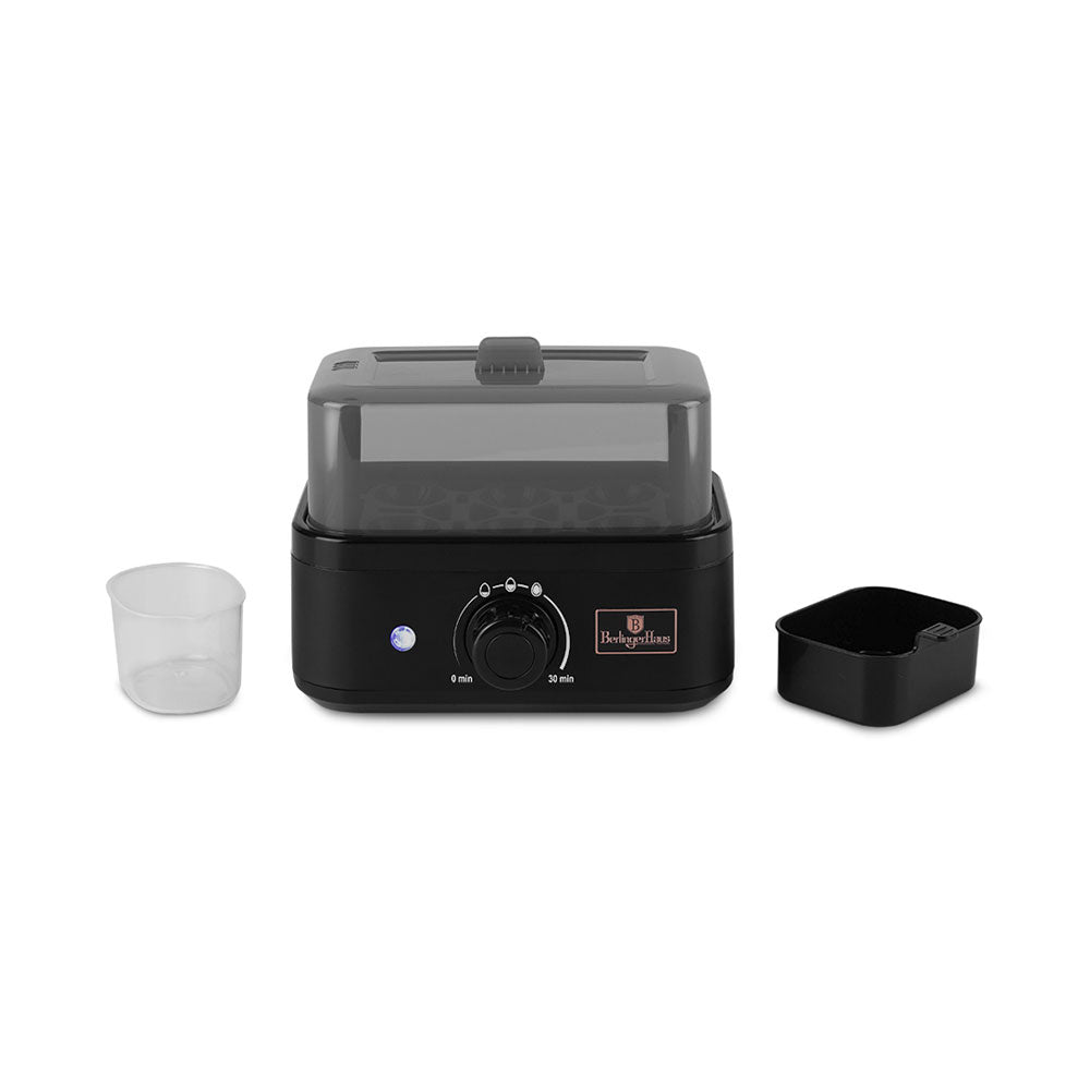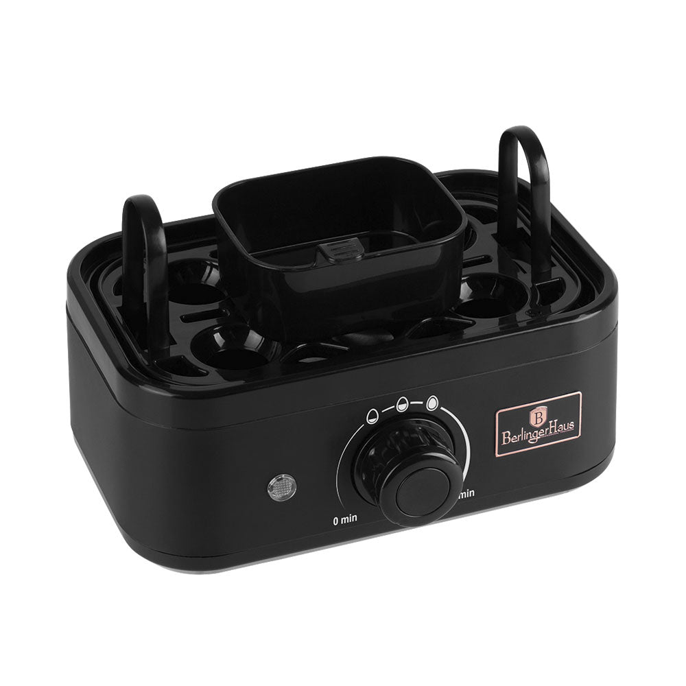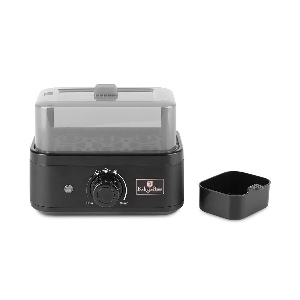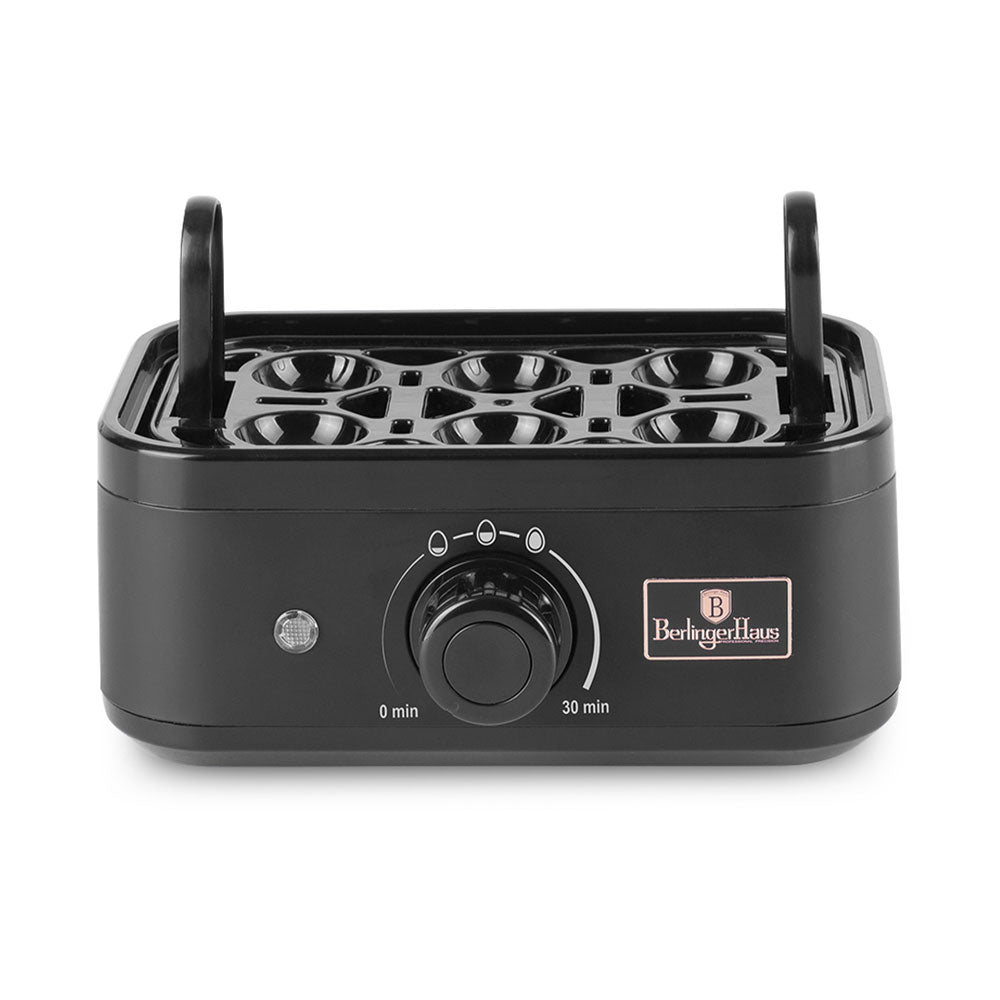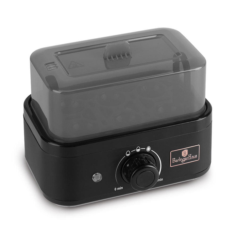 Entdecke den Berlinger Haus Eierkocher für 6 Eier aus der Black Rose Collection. Die ideale Lösung, um bis zu 6 Eier gleichzeitig perfekt zu kochen. Dieses elegante Gerät vereint modernes Design mit praktischer Funktionalität., Dank der einfachen Bedienung und der integrierten Automatik kann man die Eier ganz nach eigenem Geschmack weich, mittel oder hart zubereiten. Der transparente Deckel ermöglicht einen Blick auf den Kochvorgang, während der Überhitzungsschutz für zusätzliche Sicherheit sorgt., Mit einem kompakten Design und einem eleganten Finish in Schwarz mit Rosé-Akzenten ist dieser Eierkocher nicht nur funktional, sondern auch ein echter Hingucker in deiner Küche. Geniesse perfekt gekochte Eier für ein köstliches Frühstück oder als Snack, ganz einfach und schnell., , , Produktinformation, , 6 Eier gleichzeitig kochen, Einfache Bedienung mit Automatik, Überhitzungsschutz, Elegantes Design, Schnelles kochen, Einfach zu reinigen