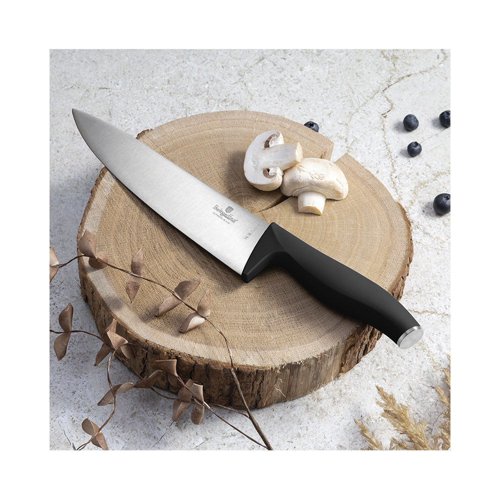 Mit dem 10-teiligen Messerset aus der Black Silver Collection von Berlinger Haus hast Du für jede Küchenaufgabe das passende Werkzeug. Die Klingen aus 3cr13 Edelstahl sind langlebig, handgeschärft und extra robust – perfekt für präzises Schneiden, Hacken oder Tranchieren. Jeder Griff liegt dank Soft-Touch-Oberfläche bequem in der Hand und gibt Dir volle Kontrolle. Der natürliche Bambusblock sorgt für eine stilvolle und ordentliche Aufbewahrung. Ob Kochmesser, Brotmesser, Santoku oder Steakmesser – Du bist für alles bestens gerüstet. Das elegante, mattschwarze Design macht das Set nicht nur praktisch, sondern auch zu einem echten Blickfang auf Deiner Arbeitsfläche. So macht Kochen gleich doppelt so viel Spass.