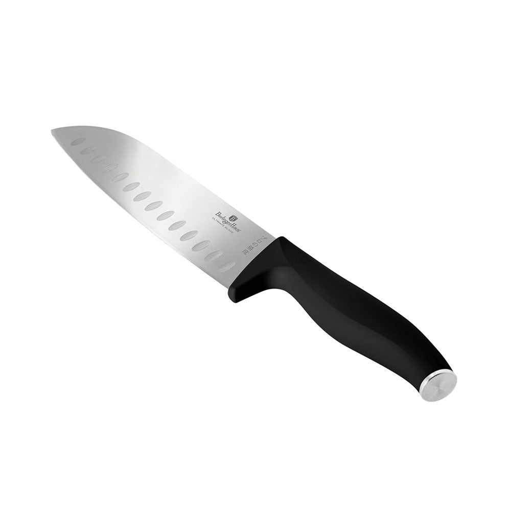 Das 6-teilige Messerset Berlinger Haus Matte Black Collection bringt Stil und Qualität in Deine Küche. Mit hochwertigem 3cr13-Edelstahl gefertigt, bleibt jedes Messer extrem scharf und rostbeständig. Im Set enthalten sind ein Kochmesser, Brotmesser, Santoku-Messer in zwei Grössen, Universalmesser und Schälmesser – perfekt für alle Schneidarbeiten. Der ergonomische Soft-Touch-Griff sorgt für einen sicheren, bequemen Halt, während der Fingerschutz zusätzliche Sicherheit bietet. Dank des edlen, mattschwarzen Designs wird dieses Set zum Hingucker in jeder Küche. Geliefert in einer magnetischen Geschenkbox, ist es nicht nur ein praktisches Werkzeug, sondern auch eine stilvolle Geschenkidee. Für eine lange Lebensdauer: Von Hand mit mildem Reinigungsmittel waschen und sofort trocknen., , , Produktinformation, , Material: Hochwertiger 3cr13-Edelstahl, rostbeständig und langlebig, Modernes, elegantes Design, Griff: Ergonomischer Soft-Touch-Griff für bequemen Halt und Fingerschutz, Magnetische Geschenkbox – perfekt als Geschenk, Reinigung: Handwäsche mit mildem Reinigungsmittel und weichem Tuch empfohlen, , Messertypen:, , Kochmesser (20 cm), Brotmesser (20 cm), Santoku-Messer (17,5 cm), Universalmesser (12,5 cm), Schälmesser (9 cm), Santoku-Messer klein (9 cm)