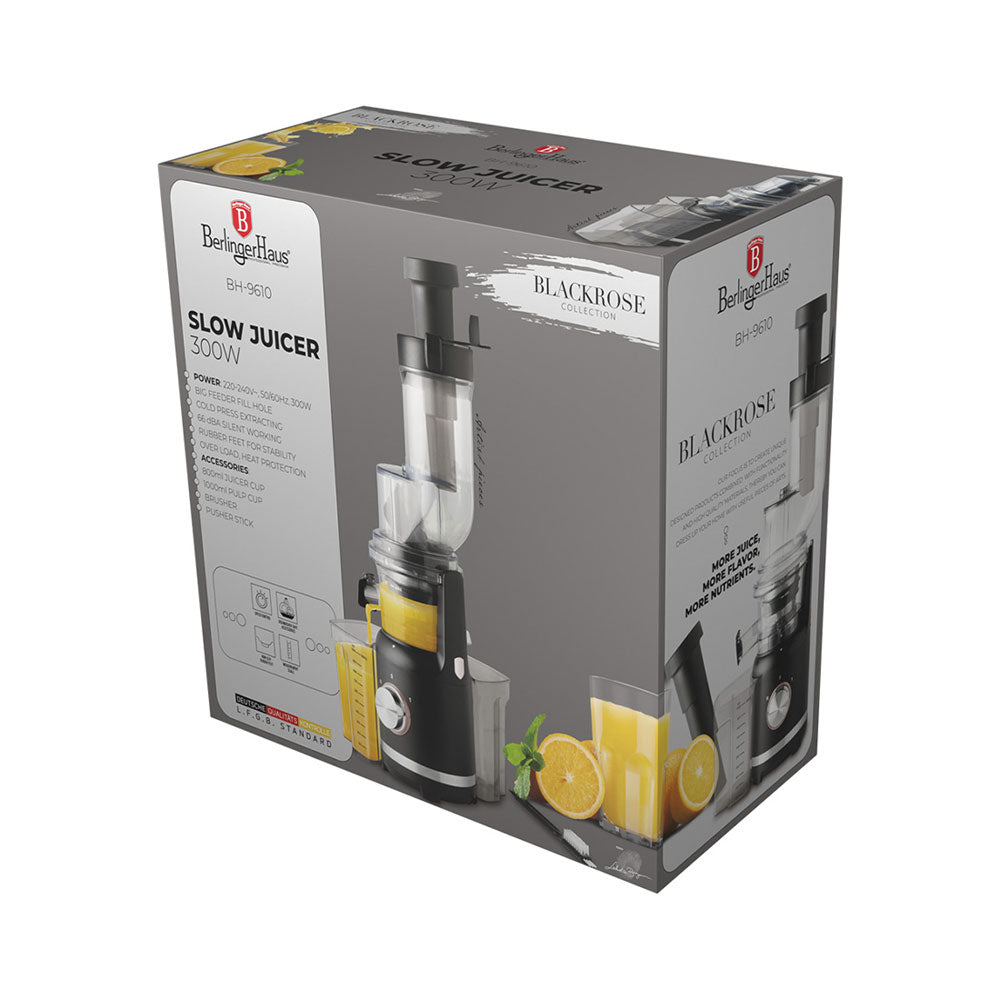 Frischer Saft lässt sich mit dem Berlinger Haus Entsafter aus der eleganten Black Rose Collection muehelos zubereiten. Das funktionelle Design sorgt nicht nur für intensiven Geschmack, sondern bringt auch die wertvollen Fruchtfasern direkt in den Saft. Ein robuster Edelstahl-Filter garantiert optimale Ergebnisse, während die grosse Einfüllöffnung das Schneiden der Zutaten auf ein Minimum reduziert. Drei einstellbare Geschwindigkeitsstufen ermöglichen die Verarbeitung verschiedenster Obst- und Gemuesearten. Zum Lieferumfang gehören ein 800 ml Entsafterbecher, ein 1000 ml Tresterbehaelter, ein Stössel sowie eine Reinigungsbürste. Gummifüsse gewährleisten stabilen Stand, während ein integrierter Überlastungs- und Hitzeschutz fuer Sicherheit sorgt. Das Gerät arbeitet leise und überzeugt durch sein edles Design in Schwarz-Rosegold.