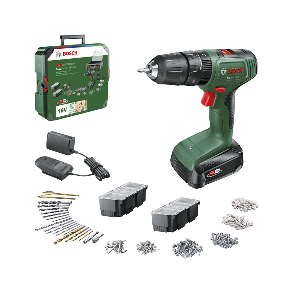 Die Bosch Akku-Schlagbohrmaschine (0.603.9D8.10C) gibt dir die Power, die du brauchst! Ob Bohren, Schrauben oder Schlagbohren – mit ihrem leistungsstarken 18V-Akku meisterst du jede Aufgabe. Dank der zwei Gänge kannst du präzise und kraftvoll arbeiten. Das LED-Licht sorgt für beste Sicht, auch in dunklen Ecken. Mit dem Schnellspannbohrfutter wechselst du Bits und Bohrer blitzschnell. Ihr ergonomisches Design macht die Handhabung besonders bequem. Egal ob Holz, Metall oder Mauerwerk – diese Maschine ist dein perfekter Begleiter für jedes Projekt!, , Lieferumfang, , 1 x Akku PBA 18V 1.5Ah, Ladegerät AL 1810 CV, 241-teiliges Zubehör-Set, System Box