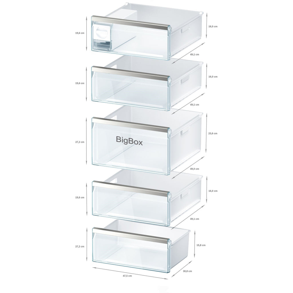 • BigBox-Gefriergutschublade: Hier finden Einfrierbehälter oder grosses Gefriergut bequem Platz. Stapeln Sie Ihre Vorräte einfach übereinander.
