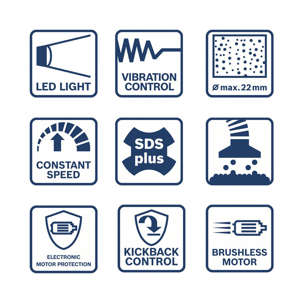 Der Bosch GBH 18V-24 C Professional ist ein vielseitiger Akku-Bohrhammer, der sich perfekt für den täglichen Gebrauch eignet. Dank seines bürstenlosen Motors bietet er erhöhten Schutz vor Verletzungen durch Funktionen wie KickBack Control und Vibration Control. Das HMI-Display liefert nützliche Informationen zum Akkustand und anderen relevanten Hinweisen. Mit dem integrierten Bluetooth-Modul können Sie schnell und einfach eine Verbindung zur Bosch Toolbox App herstellen, um individuelle Einstellungen vorzunehmen. Durch die Kompatibilität mit dem Staubabsaugsystem GDE 18V-16 Professional von Bosch lässt sich der Bohrhammer mit einem Klick anbringen. Der GBH 18V-24 C Professional eignet sich für Bohr- und Meisselarbeiten in verschiedenen Materialien wie Holz, Metall, Beton und Mauerwerk. Er ist mit allen Akkus und Ladegeräten des Bosch Professional 18V Systems kompatibel und bietet zusätzliche Funktionen wie Constant Speed, Electronic Motor Protection (EMP), LED-Licht, Rotation Control Clutch, variable Drehzahl und Vario-Lock., , , Produktinformation, , Mehr Komfort und weniger Belastung, auch bei Überkopfarbeiten, Hammerbohren mit geringem Gewicht, Anklippbarer Sauger, Unterbrechungsfreies Arbeiten dank verbesserter Laufzeit, Kompatibel mit Bosch Professional 18V Systemen, Bluetooth-Modul für Toolbox App, Bürstenloser Motor mit KickBack Control und Vibration Control, Bohren und Meisseln in verschiedenen Materialien, , Lieferumfang, , 1x Bosch Akku-Bohrhammer GBH 18V-22, 1x Reinigungstuch (1 619 200 413), 1x Tiefenanschlag (1 613 001 009), (ohne Akku und Ladegerät)