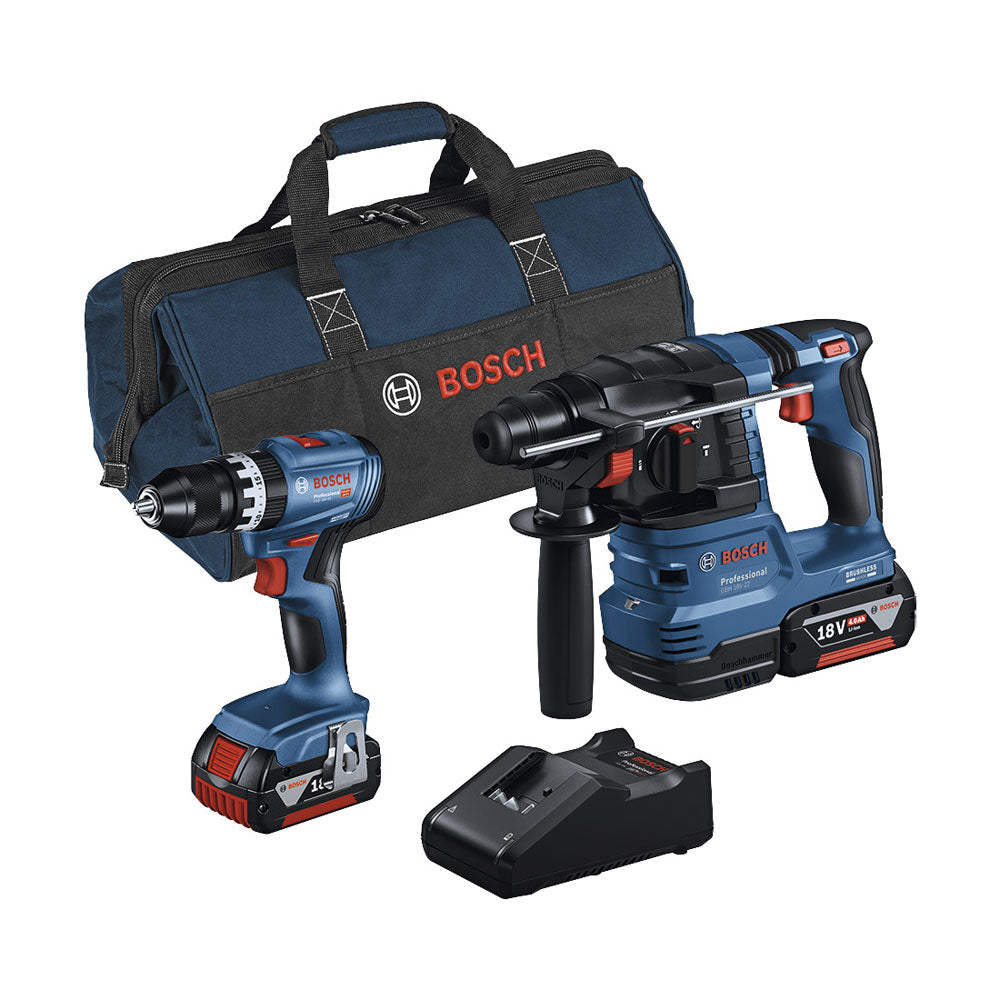 Mit dem Bosch 2-teiligen Kit bist du perfekt ausgerüstet! Der GBH 18V-22 und der GSB 18V-45 bieten dir kraftvolle Leistung für jede Aufgabe. Dank innovativer Schutzfunktionen arbeitest du sicher und effizient. Mit den beiden 4.0-Ah-Akkus und dem Schnellladegerät GAL 18V-40 bist du jederzeit einsatzbereit. Alles kommt kompakt in einer praktischen Tasche – ideal für unterwegs. Egal ob Bohren oder Schrauben, dieses Set macht deinen Arbeitsalltag einfacher und effektiver!, , , Produktinformationen, , Daten zu GBH 18V-22:, Schlagenergie (J): 1.9, Leerlaufdrehzahl: 0 – 1.050, Schlagzahl (bpm): 0 – 4.675, Bohrdurchmesser in Beton max. (mm): 22, Daten zu GSB 18V-45:, Leerlaufdrehzahl: 0 – 1.900, Motor: EC, Drehmoment max. (hart/weich): 45 / 21 Nm, Schlagzahl (bpm): 0 – 27.000, , Lieferumfang, , GBH 18V-22, GSB 18V-45, 2x GBA 4.5 Ah, GAL 18V-40, Tasche