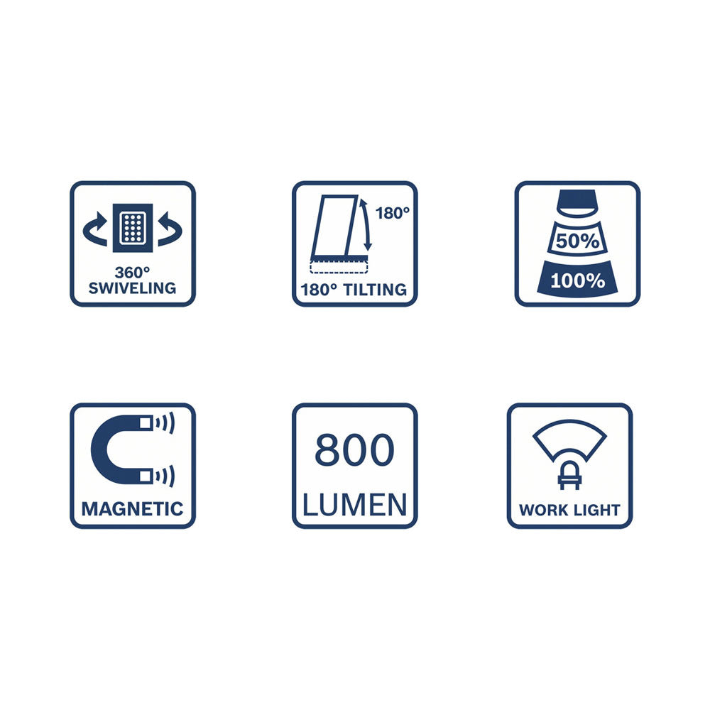Die GLI 18V-800 Akku-Leuchte von Bosch ist die ideale Lichtlösung für präzise Arbeitsbereiche! Mit beeindruckenden 800 Lumen bietet diese vielseitige Arbeitsleuchte mit 20 LEDs eine hervorragende Beleuchtung für Elektriker, Klempner und andere Profis. Das kompakte Design der Lampe wird durch einen starken Magneten und einen drehbaren Metallhaken ergänzt, was eine flexible Platzierung ermöglicht. Der innovative Klappmechanismus erlaubt eine 360° Drehung und 180° Neigung des Lampenkopfes. Dank der 3 Helligkeitsstufen kann die Beleuchtung nach Bedarf angepasst werden und die Ein-Knopf-Bedienung gewährleistet eine einfache Handhabung. Die GLI 18V-800 Professional ist mit allen 18-V-Akkus und Ladegeräten der AMPShare-Akkuplattform von Bosch kompatibel., , , Produktinformation, , Hervorragende Ausleuchtung, Vielseitige Platzierungsmöglichkeiten dank Magneten und Metallhaken, Klappmechanismus für 360° Drehung und 180° Neigung., 3 Helligkeitsstufen bis zu 800 Lumen mit allen 18-V-Akkus und Ladegeräten der AMPShare, Akkuplattform kompatibel, einschliesslich aller Akkus und Ladegeräte des Bosch Professional 18-V-Systems.