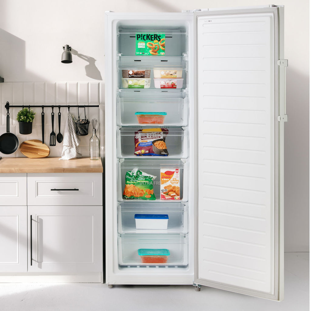 Mit seinem grosszügigen Nutzinhalt von 238 Litern bietet der DO91205F ausreichend Platz für Vorräte, während das automatische „NO FROST“-System für konstante Kühlleistung ohne Eisbildung sorgt. Der praktische Hebelgriff erleichtert das Öffnen, und die flexible Türmontage ermöglicht eine optimale Anpassung an jede Küche oder jeden Abstellraum. Dank der Super-Freeze- und Super-Cool-Funktion werden Lebensmittel besonders schnell heruntergekühlt oder eingefroren, während der Tür-offen-Alarm zusätzliche Sicherheit bietet. Besonders praktisch ist die Doppel-Funktion: Der Gefrierschrank lässt sich flexibel auf Temperaturen zwischen –24 und +8 °C einstellen und kann so auch als Kühlschrank genutzt werden – ideal für wechselnde Bedürfnisse. Mit leisem Betrieb, energieeffizientem Inverter-Kompressor und klarer Aufteilung durch Schubladen und Fächer ist der DO91205F die perfekte Lösung für zuverlässige Lagerung und maximale Flexibilität.