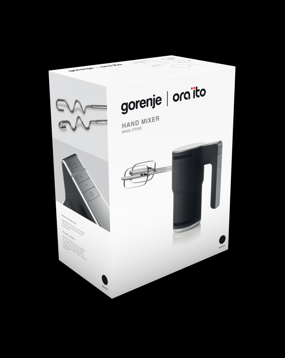 Handmixer Ora-Ïto Black:5 GeschwindigkeitsstufenSlow start functionTurbotasteAuswurftaste für AufsätzeKnethaken und Quirle aus hochwertigem EdelstahlSpülmaschinengeeignete Rühraufätze400 W Leistung100 cm Kabellänge
