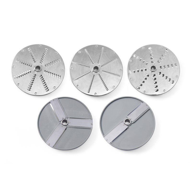 Geeignet zum schneiden grosser Gemüsemengen. Beinhaltet 5 verschiedene Messer für unterschiedliche Schneidresultate: Schneidscheiben: 2 und 4 mm, Raspelscheiben 3, 5 und 7 mm. Grosse Öffnung mit Hebel zum Beigeben grosser Stücke. Kleine Öffnung zum Beigeben kleiner Stücke. Gehäuse aus Aluminiumguss. 2 Schutzsysteme: 1 Schutz - Fixierschraube für den Deckel, 2 Schutz - elektromagnetischer Sensor (beim Öffnen des Deckels schaltet sich das Gerät ab). Geschwindigkeit: 295 U/Min. Gewicht: 24 kg.