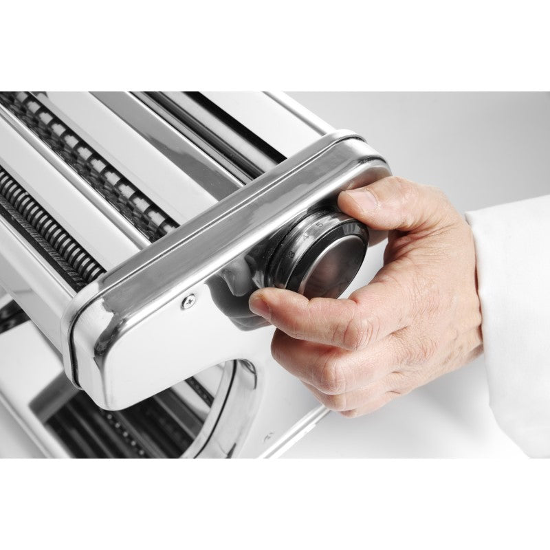 Optimal für die Zubereitung von frischer Pasta. Für eine maximale Breite des Teigs von bis zu 170 mm. Mit Sicherheitsabschaltung. Stärke der Pasta 7-stufig einstellbar: von 0,2 bis 2,5 mm. 3 Aufsätze zur Zubereitung verschiedener Pastasorten: Teigroller, Tagliatelle (6,25mm) und Fettucine (2mm).