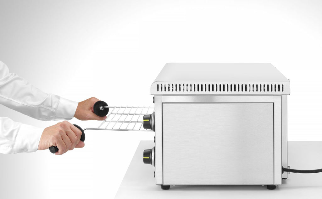 Zum Zubehör gehören ein Gitter mit 2 isolierten Griffen und ein praktisches Krümelfach für eine unkomplizierte Reinigung. Der Salamander GN 1/1 von Hendi bietet somit eine zuverlässige und vielseitige Lösung für professionelle Küchen.