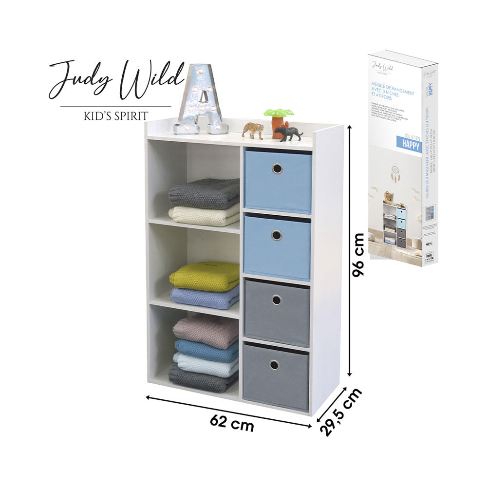 Das Judy Wild Aufbewahrungsregal ist die perfekte Lösung für Ordnung im Kinderzimmer oder Flur – für Jungen und Mädchen gleichermaßen! Mit drei praktischen Ablagefächern und vier Schubladen bietet es jede Menge Stauraum für Spielzeug, Bücher und alles, was sonst noch einen Platz braucht. Der Aufbau geht super leicht und schnell, sodass es im Nu einsatzbereit ist. Dank der stabilen Konstruktion steht das Regal sicher, selbst wenn es mal wild zugeht. Ein echtes Must-have, um Chaos zu bändigen und gleichzeitig einen stylischen Hingucker ins Kinderzimmer zu bringen!, , , Produktinformation, , Leichter Zusammenbau, 3 Ablagen und 4 Schubladen, Stabiler Stand, Masse Schublade (LxBxH): 22.5 x 27 x 20 cm, Lieferumfang : 1 Kommode mit 4 Schubladen