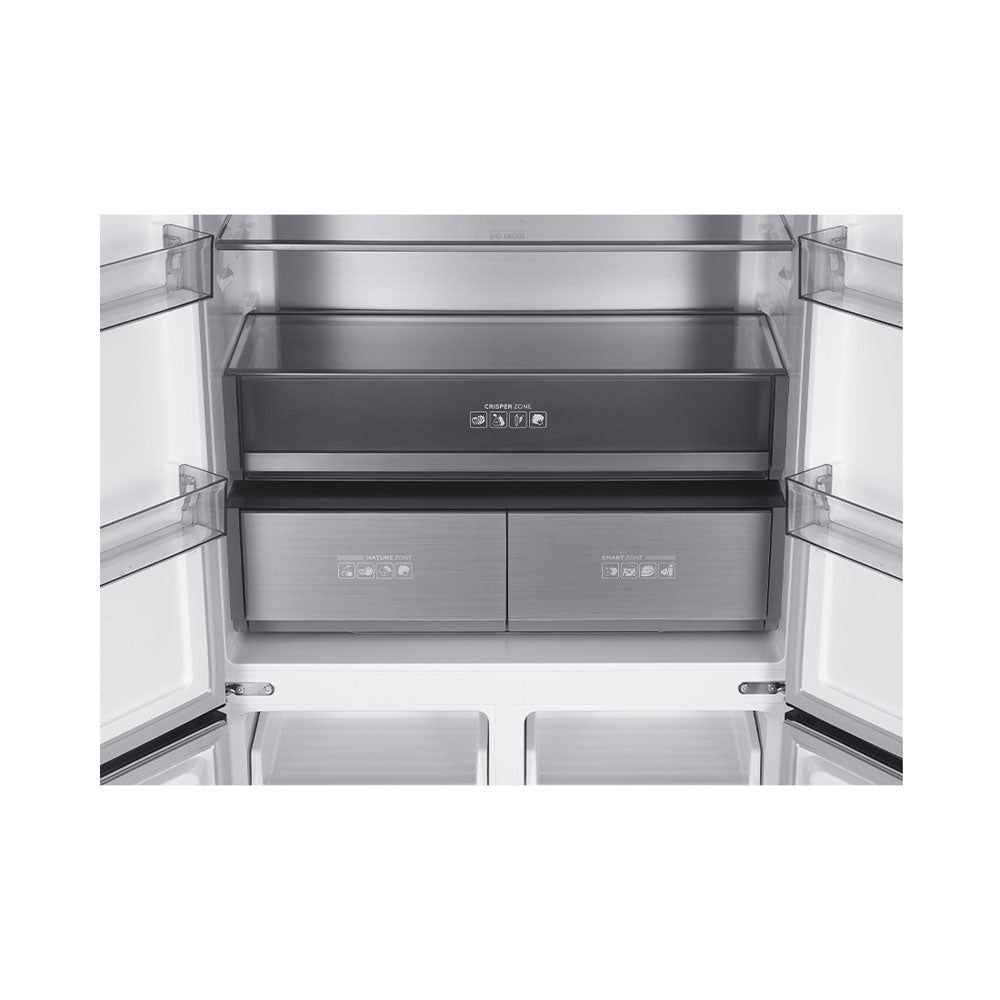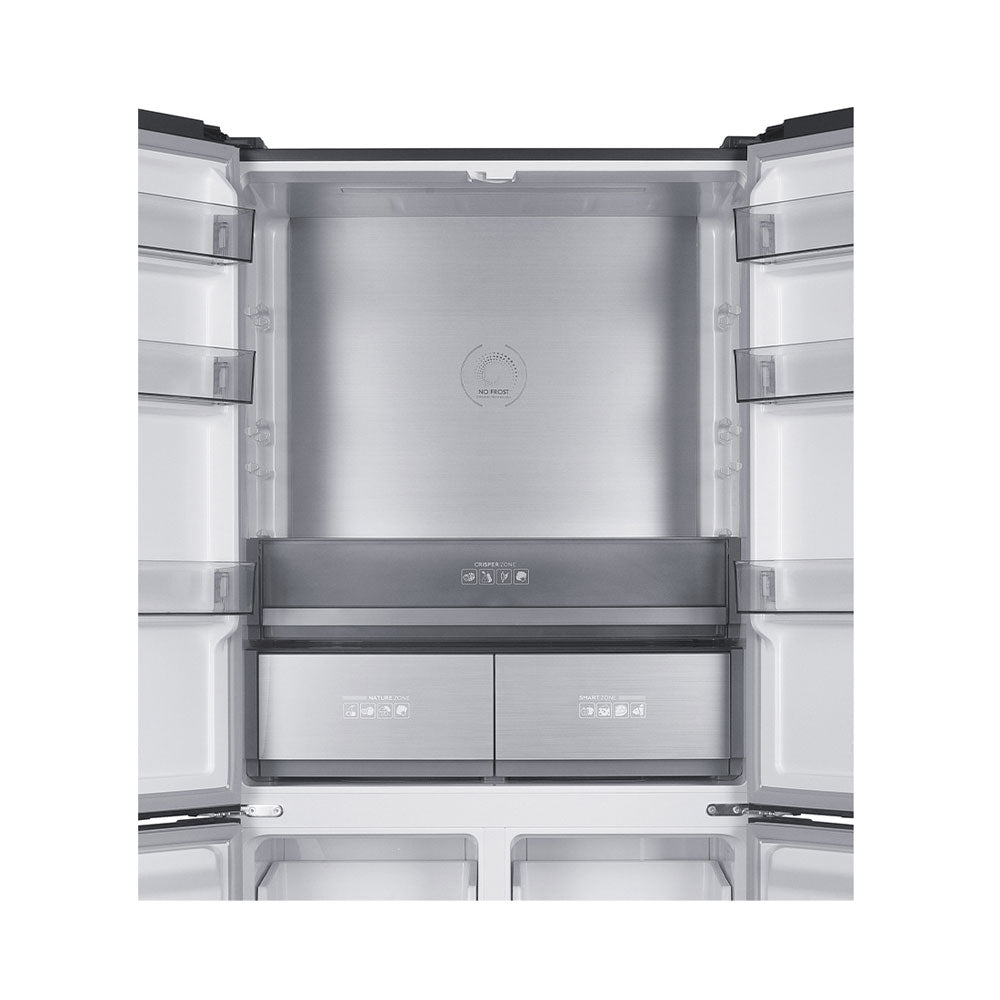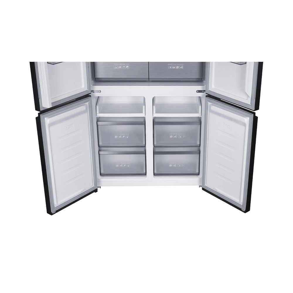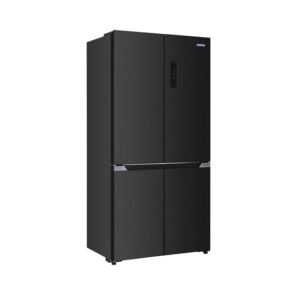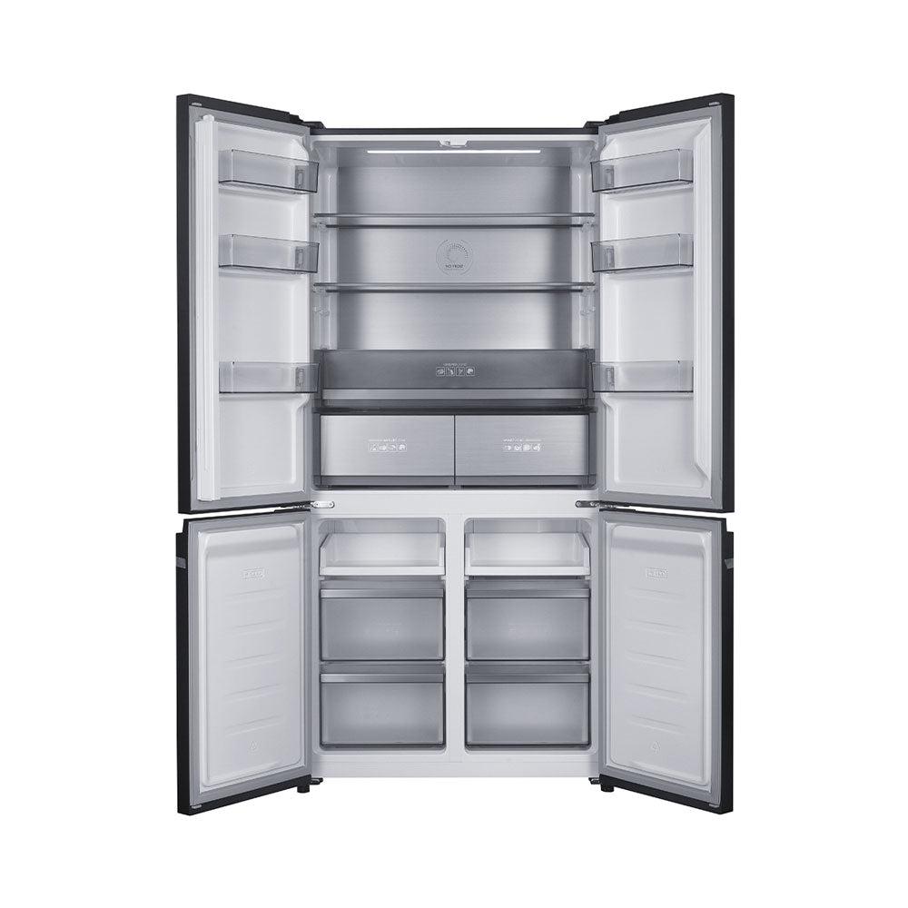 Das Kibernetik FCCD505NF Food Center verbindet grosszügigen Stauraum mit moderner Kühltechnologie. Mit einem Gesamtnutzinhalt von 505 Litern, davon 349 Liter im Kühl- und 156 Liter im Gefrierbereich, bietet es reichlich Platz für Lebensmittel und Getränke. Die Ausstattung umfasst drei Tablare, sieben Schubladen, zwei ausziehbare Schubladen sowie sechs Türfächer, die eine flexible und übersichtliche Organisation ermöglichen. Dank No-Frost-Funktion entfällt das Abtauen, während die VitaFresh-Schubladen für optimale Frische bei Obst, Gemüse, Fleisch und Fisch sorgen. Das Gerät arbeitet mit 39 dB(A) und überzeugt durch einen sparsamen Energieverbrauch von 312 kWh pro Jahr (Effizienzklasse E). Mit schwarzem Design, robustem Aufbau und beidseitig montierbarem Türanschlag fügt sich das freistehende Food Center harmonisch in verschiedene Wohn- und Küchenumgebungen ein.