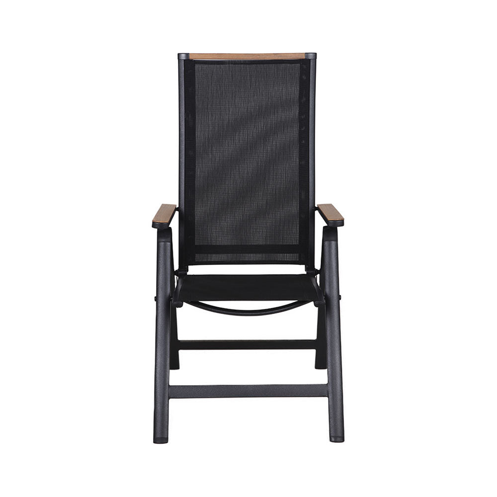 Dieser Gartenstuhl mit Lehne in ansprechender Holzoptik fügt sich perfekt in jede Aussenumgebung ein. Mit Abmessungen von 58 x 71 x 111 cm bietet er einen komfortablen Sitzplatz für entspannte Stunden im Freien., , Dieser Stuhl ist nicht nur bequem, sondern auch äusserst praktisch: Dank seiner klappbaren Konstruktion ist er platzsparend verstaubar und lässt sich mühelos zusammenklappen. Somit ist er ideal für kleinere Terrassen oder Balkone geeignet., , Die Witterungsbeständigkeit dieses Gartenstuhls macht ihn zu einem zuverlässigen Begleiter in jeder Jahreszeit. Seine Rückenlehne ist 5-fach verstellbar, sodass du die perfekte Sitzposition für maximalen Komfort finden kannst., , Die Armlehnen und die obere Leiste des Stuhls sind mit einer edlen Nonwood-Verkleidung versehen, die nicht nur stilvoll aussieht, sondern auch langlebig ist. Das Gestell besteht aus Aluminium und Kunststoff, während die Sitzfläche aus strapazierfähigem 2-in-1-Textilene-Material gefertigt ist., , Geniesse entspannte Stunden im Freien mit diesem eleganten und funktionalen Gartenstuhl!, , , Produktinformation, , Gartenstuhl mit Lehne in Holzoptik, klappbar, Masse: 58 x 71 x 111 cm, Platzsparend verstaubar, zusammenklappbar, Witterungsbeständig, 5-fach verstellbarer Rückenlehne, Armlehnen und obere Leiste in edler Nonwood Verkleidung, Material: Gestell - Aluminium, Kunststoff, Sitzfläche 2in1 Textilene