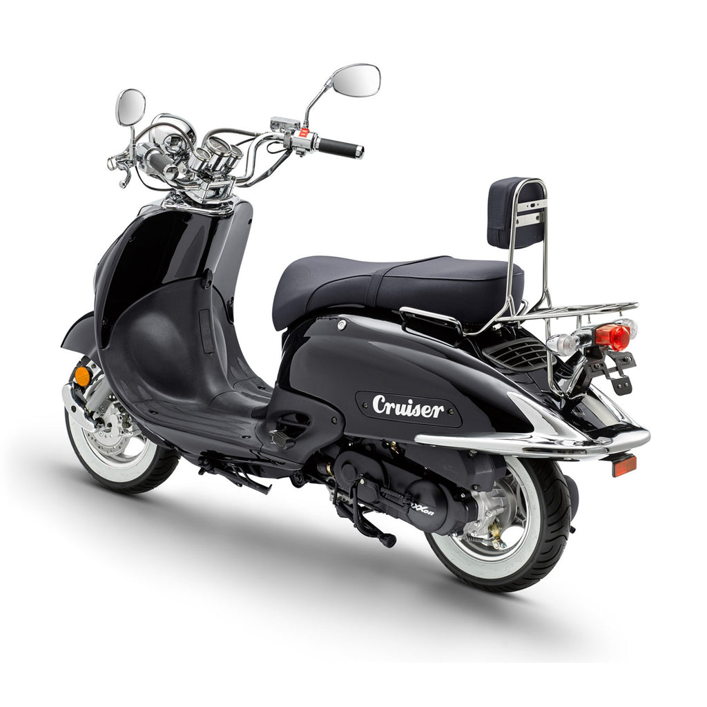 Der breite Butterfly-Lenker sorgt für eine sichere und komfortable Lenkung, während die dreiteiligen Instrumente alle wichtigen Informationen wie Geschwindigkeit und Tankfüllstand an den Fahrer weitergeben. Mit der umfangreichen Serienausstattung, zu der auch Weisswandreifen, Beifahrer-Rückenlehne und Gepäckträger gehören, ist der Cruiser Motorroller ein wahres Komplettpaket.