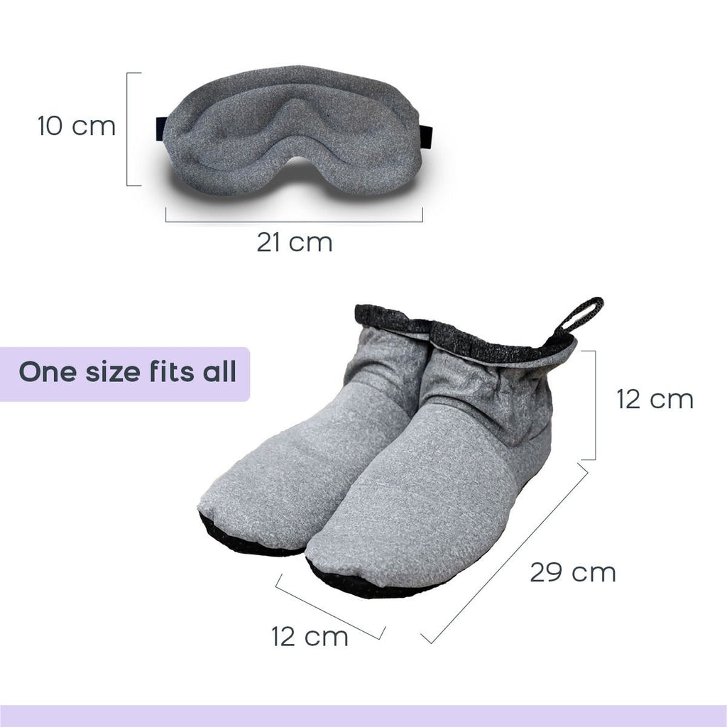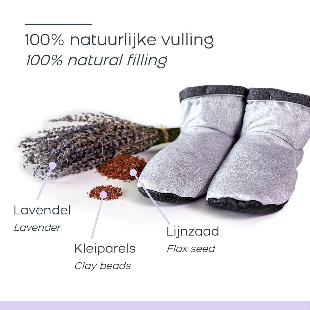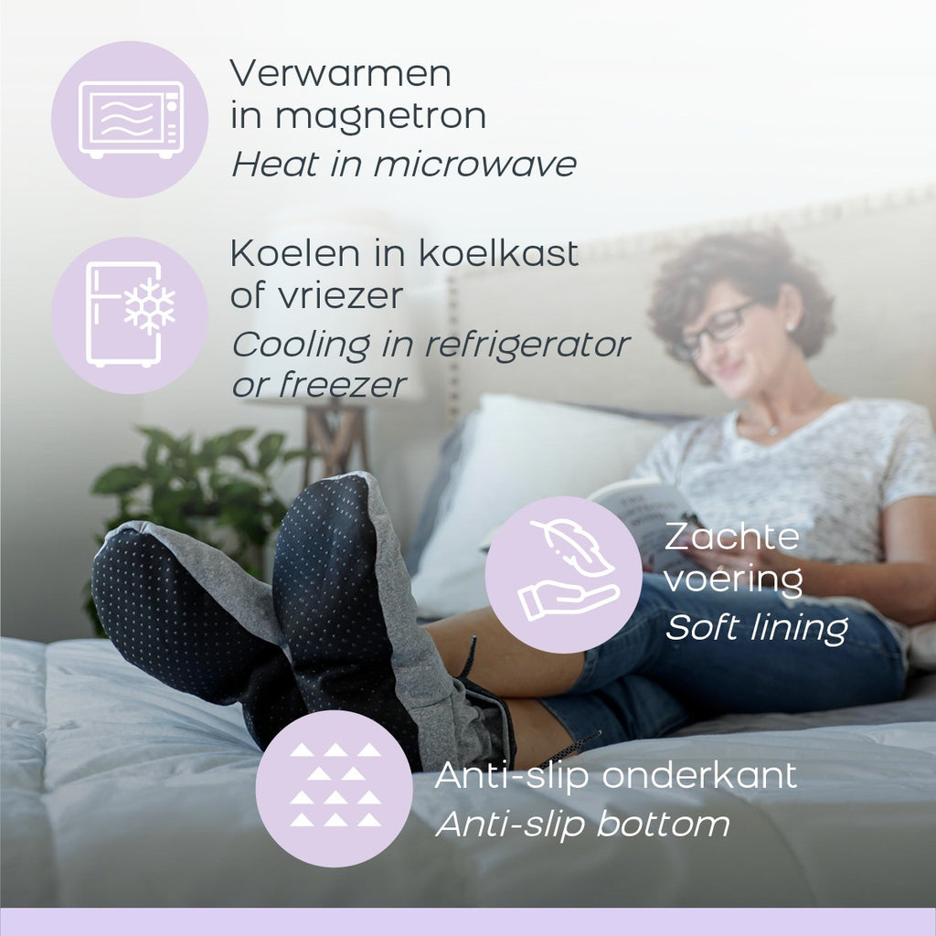 Bottes chaudes et fraîches, pantoufles Vous souffrez de pieds endoloris après une longue journée de travail, de pieds froids lorsque vous êtes assis sur le canapé ou de pieds trop chauds en été ? Avec les chaussons Cozy Boots, c'est du passé. Ces pantoufles offrent la détente ultime, gardant vos pieds au chaud et confortables en hiver et frais en été. Le point fort est que vous pouvez mettre les chaussons au micro-ondes pour les réchauffer et au réfrigérateur ou au congélateur pour les refroidir. Le garnissage naturel à base de graines de lin et d'argile maintient la température particulièrement longtemps. Découvrez la chaleur ou le refroidissement merveilleusement relaxant de vos pieds dans tout votre corps. De plus, il contient également de la lavande. La lavande dégage un parfum merveilleux qui vous garantit une détente optimale. Les pantoufles ont un design unisexe et sont entièrement réglables à votre pointure. De plus, ils sont fabriqués à partir de peluche ultra douce de qualité supérieure, ont un dos antidérapant et sont livrés avec un cordon qui vous permet de connecter les pantoufles pour garantir qu'aucune perte de chaleur ou de refroidissement n'est perdue. Masque de nuit Cozy Eyes à la lavande Et ce n'est pas tout, car si vous commandez les Cozy Boots maintenant, vous recevrez également les Cozy Eyes. Ce masque pour les yeux est composé des mêmes matériaux et possède les mêmes propriétés relaxantes.
